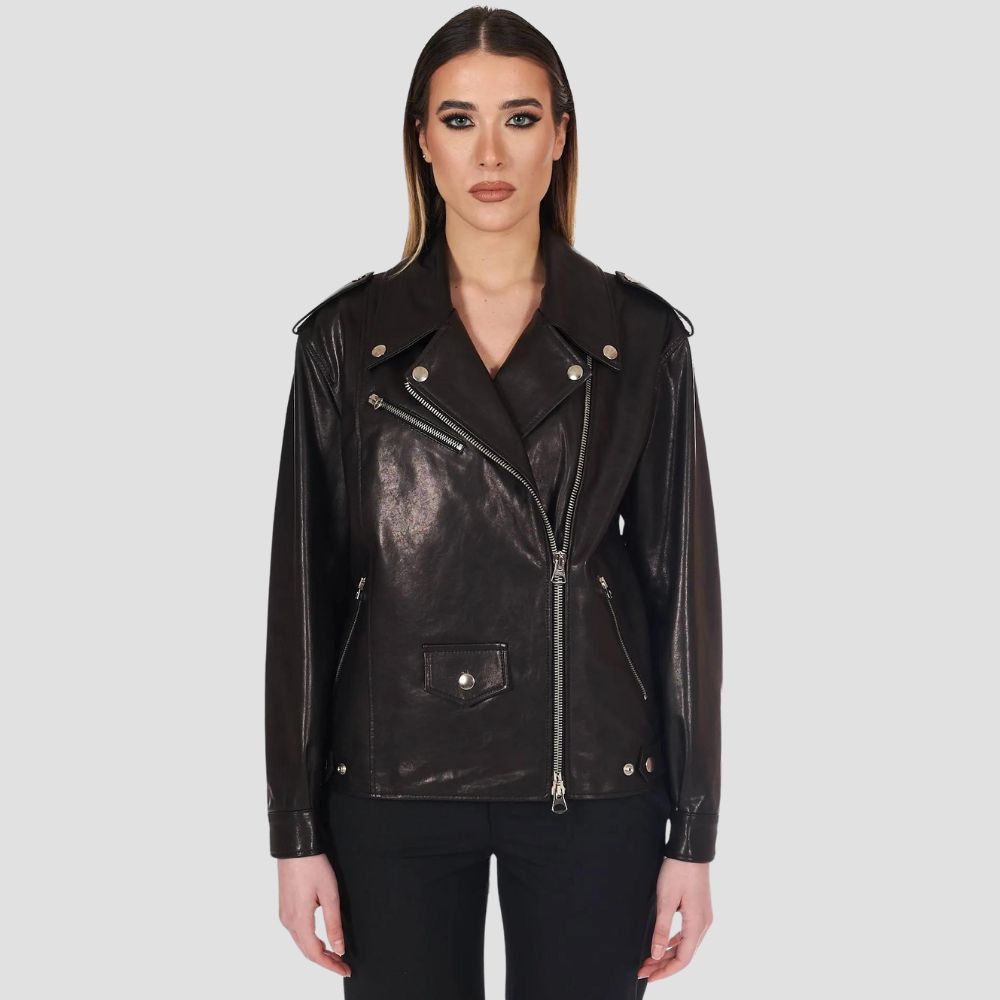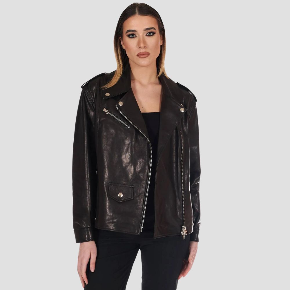 Description: The style proposed 'Jacket Biker Camy' in soft genuine leather is composed by: 3 front zipper pockets;Lapel collar;flaps on...