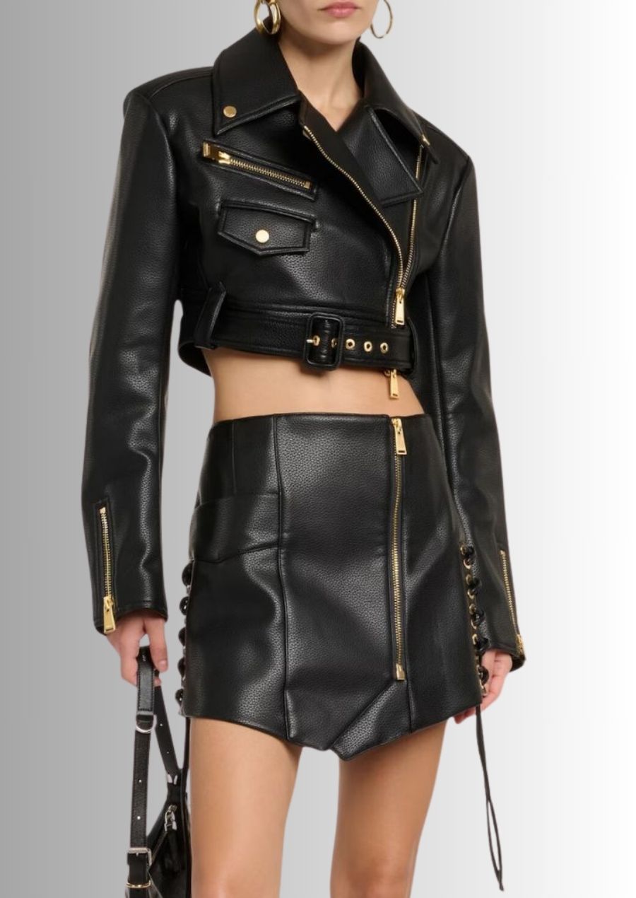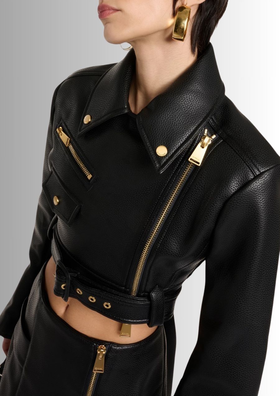 Description: Shoulder pad insertsCinched waistAdjustable at the waistNon-stretchy fabricCroppedMaterial: LEatherCare instructions: dry cleanDesigner color name: BlackLining: 100% viscose