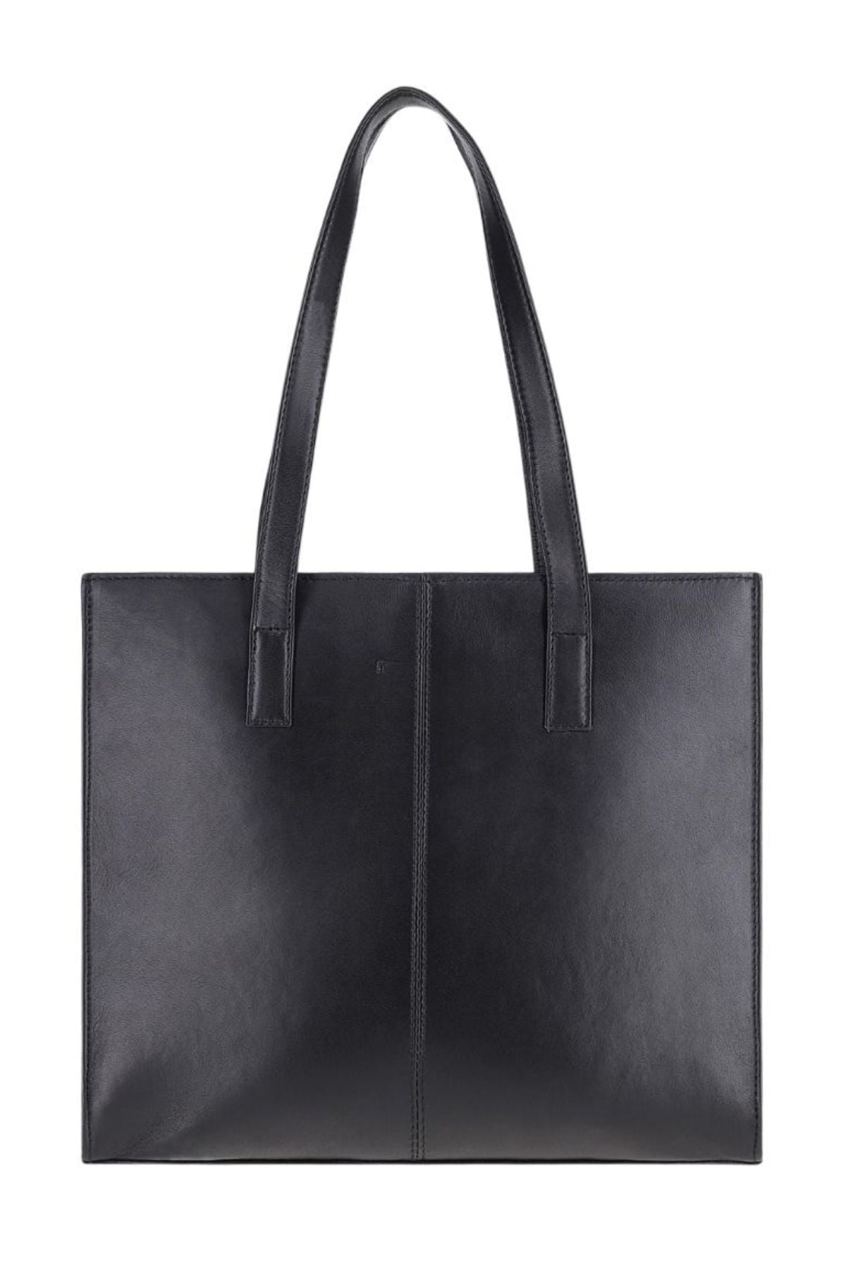 Description: Classic black leather tote bag featuring minimalist design, dual shoulder straps, and center seam detail. Crafted from premium smooth...