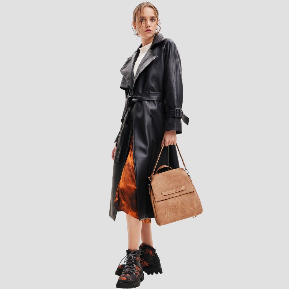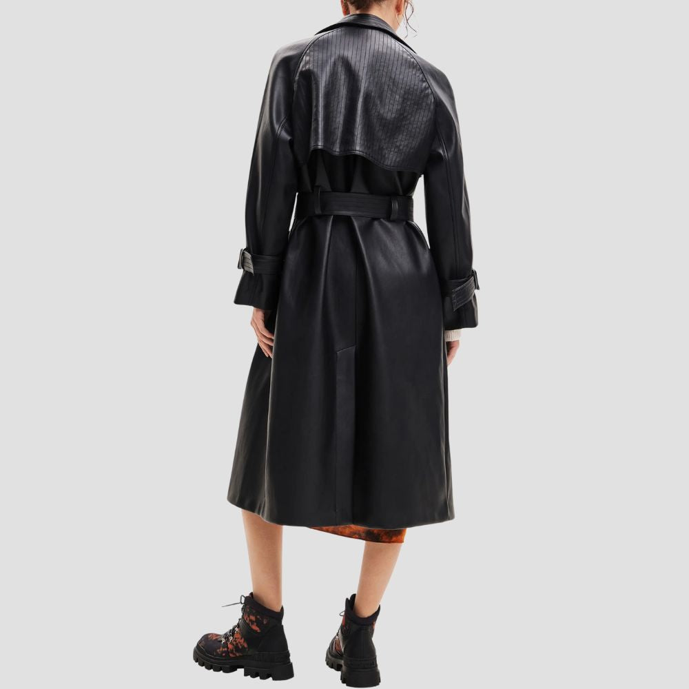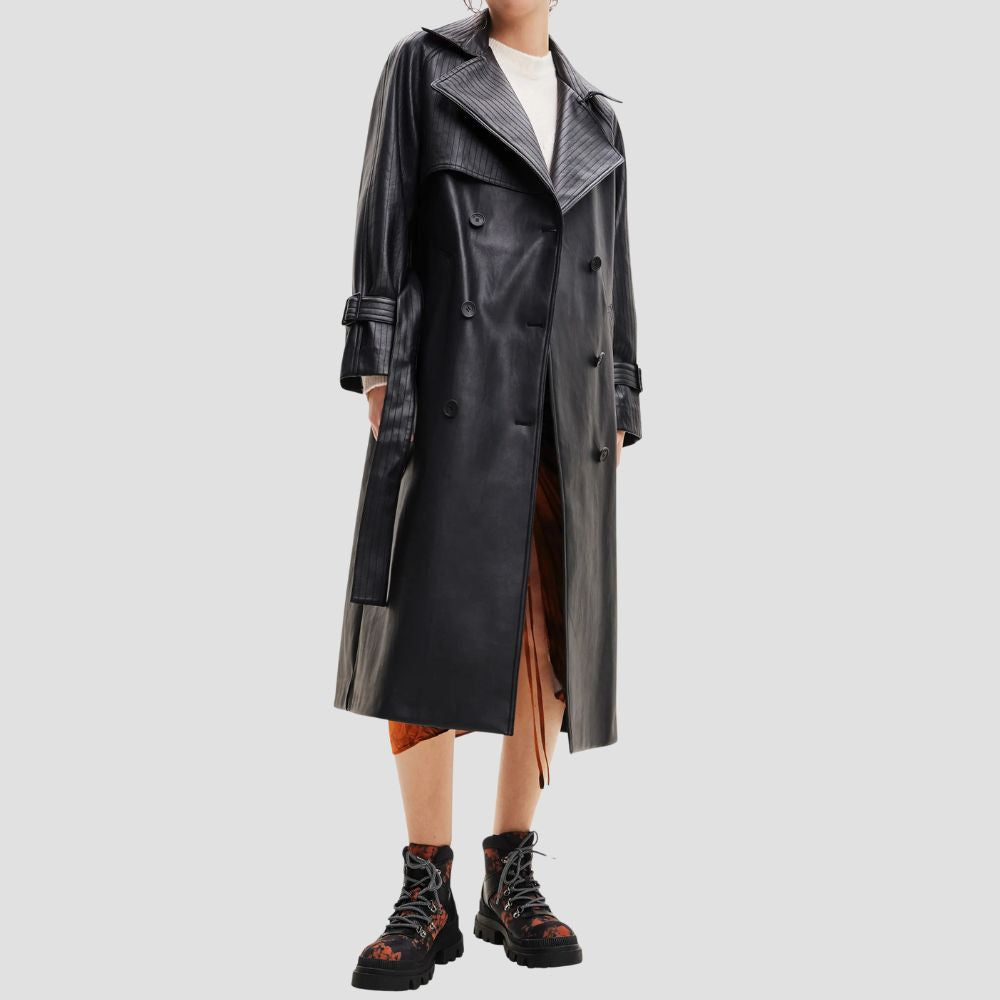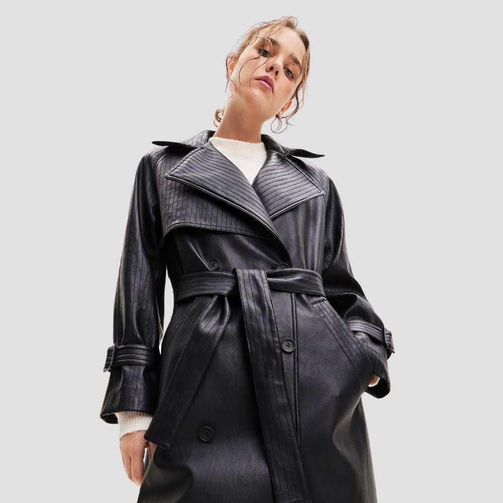 Description: Subtle texturing on the sleeves, collar and storm flap enhances the visualintrigue of this belted faux-leather trench coat. Color:...
