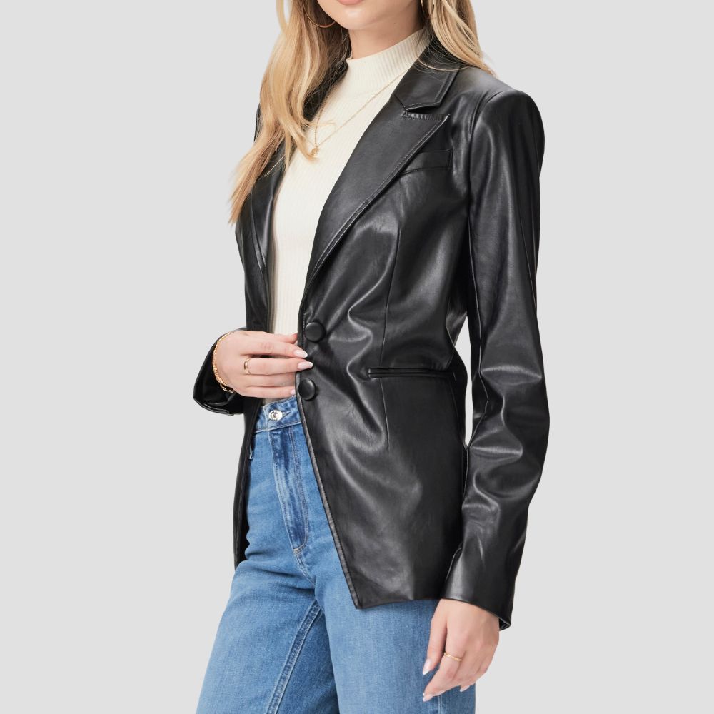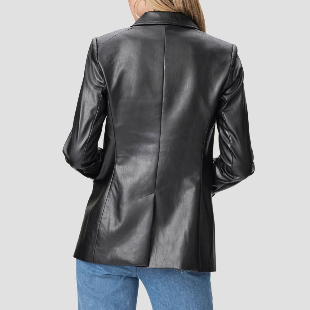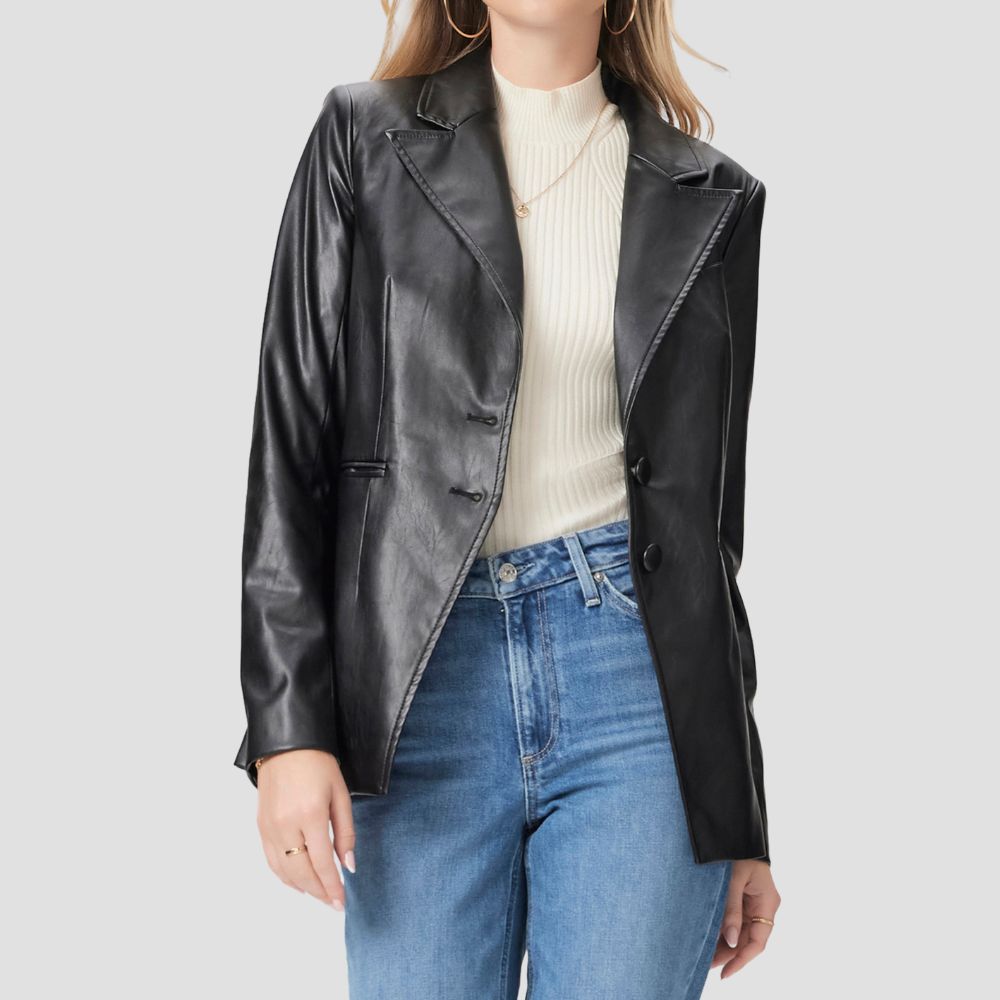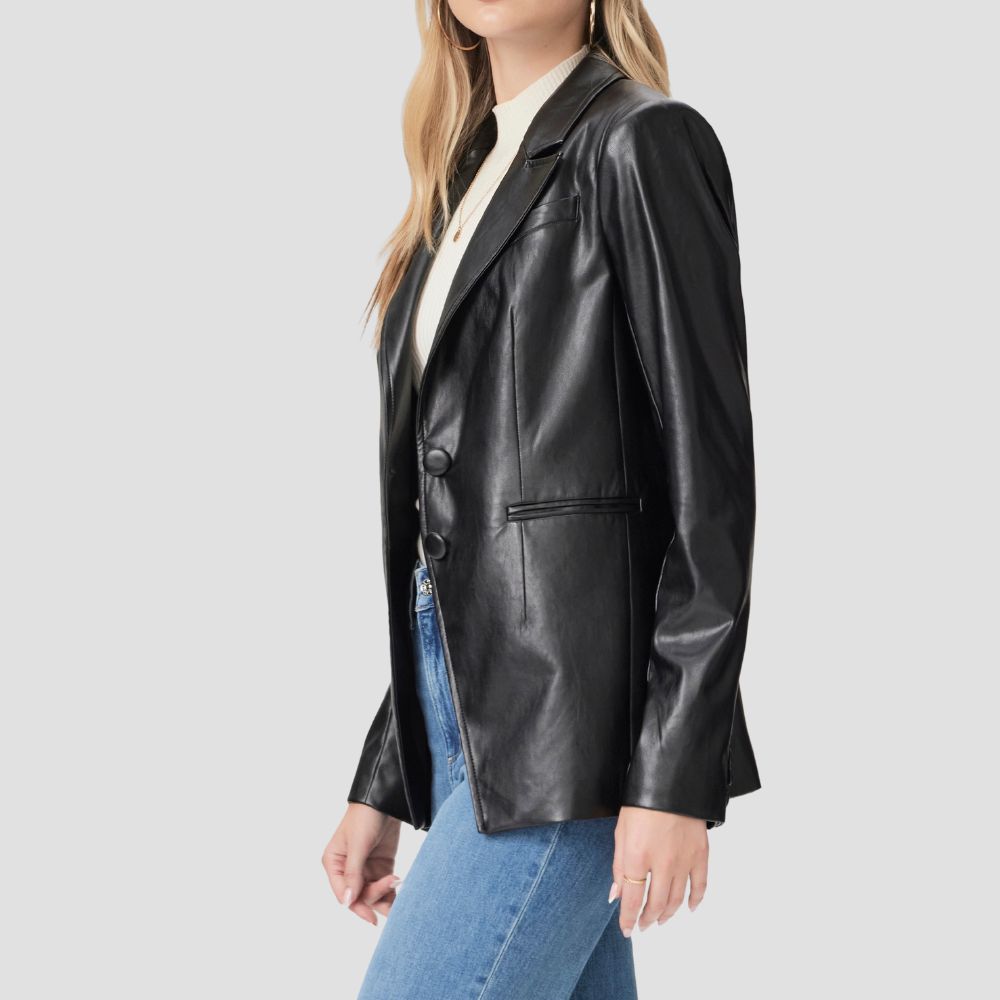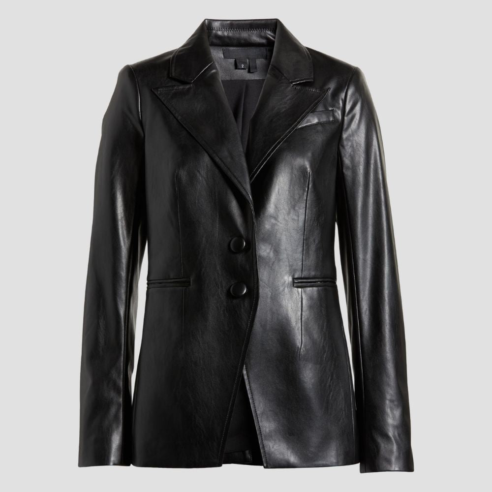 Description: This tailored two-button blazer is crafted from sleek faux leather with an airy back vent. Color: Black Front button...