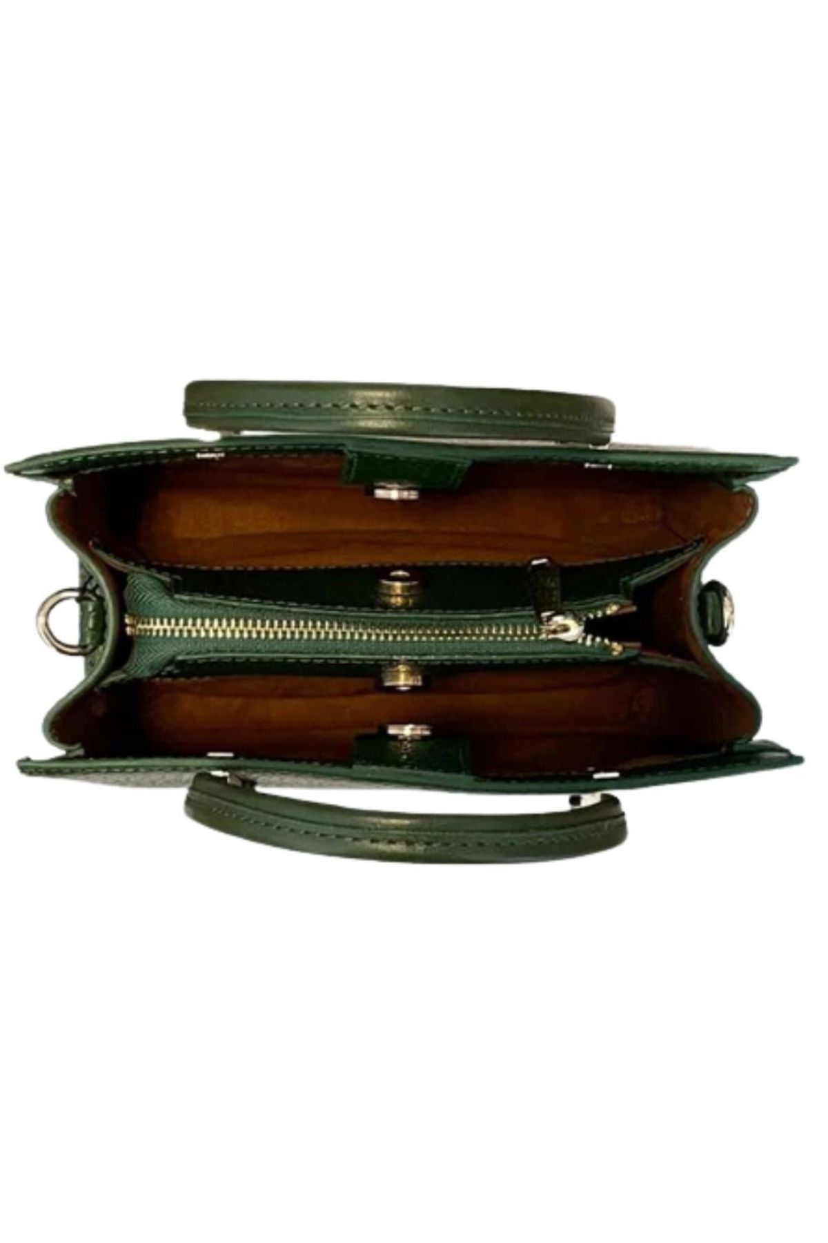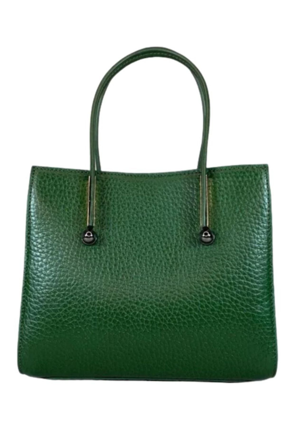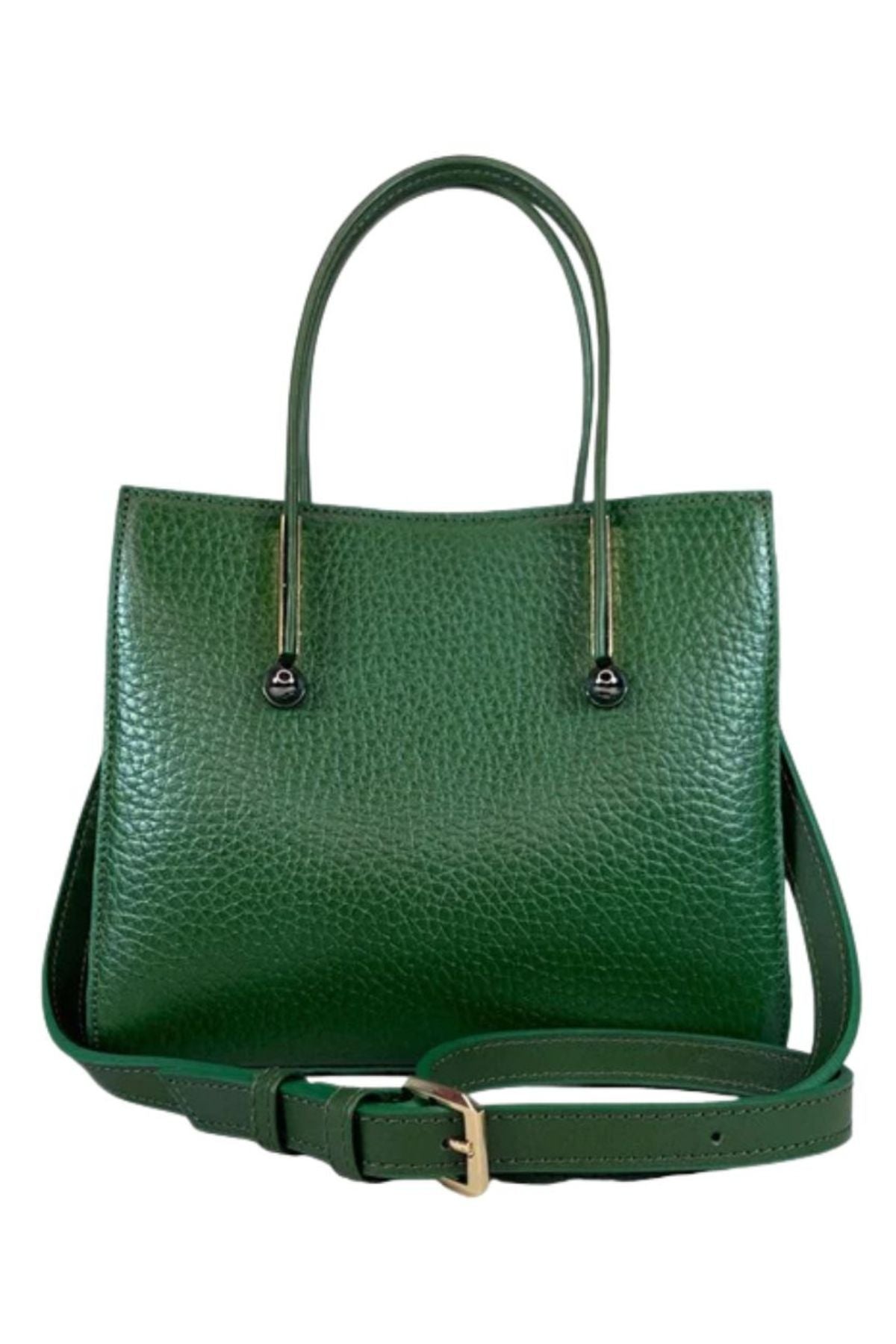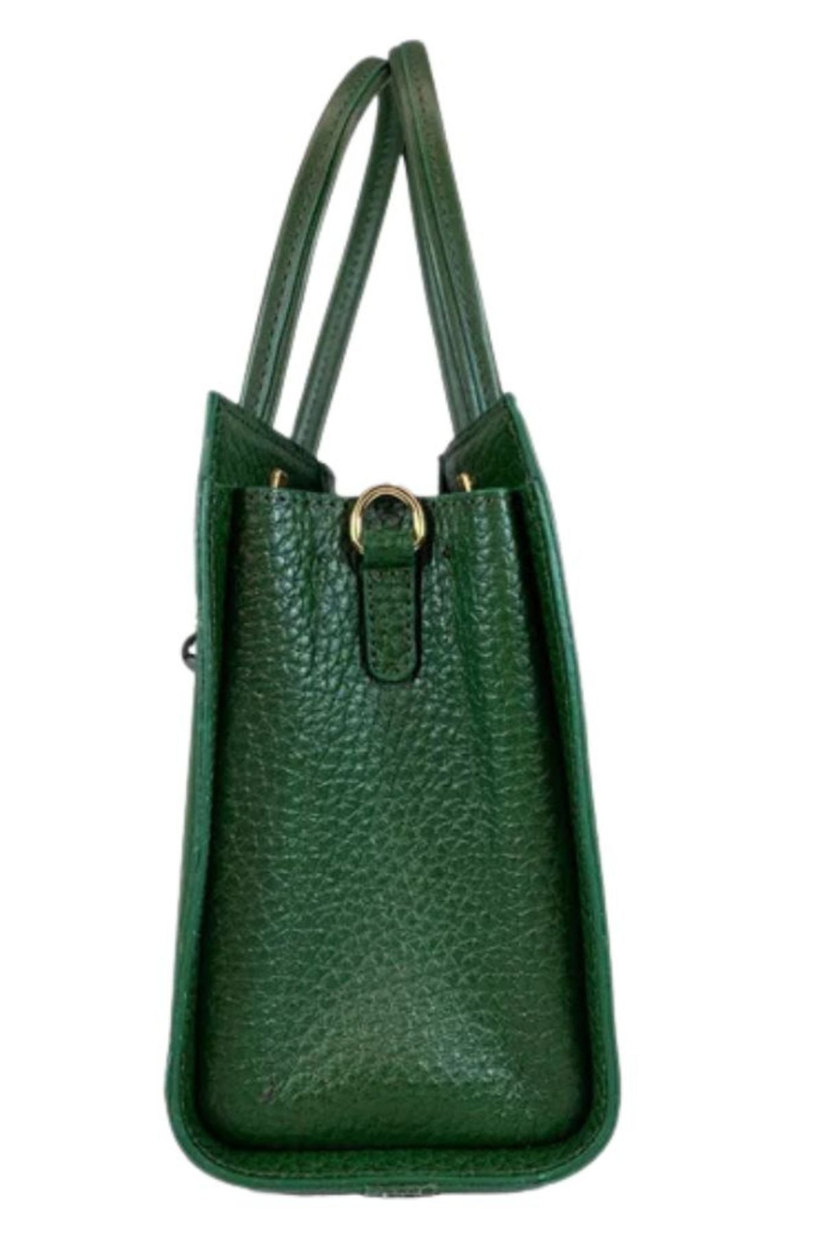 Description: Elegant green textured leather handbag featuring pebbled finish, dual top handles, detachable crossbody strap, and dual compartments with center...