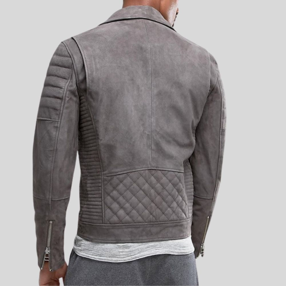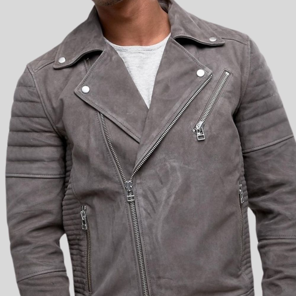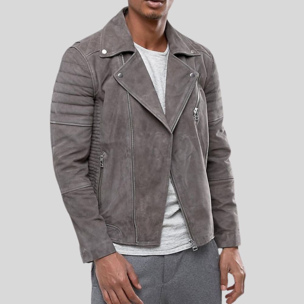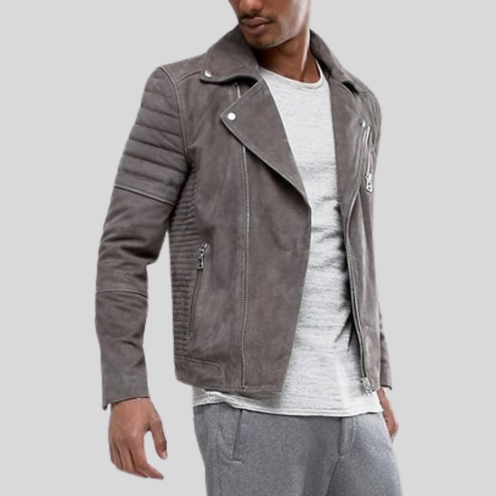 Description: Edgy grey suede biker jacket featuring asymmetric zip closure, quilted shoulder panels, and multiple zipper pockets. Crafted from premium...