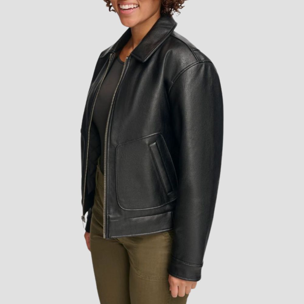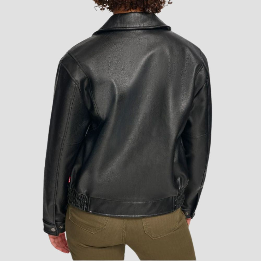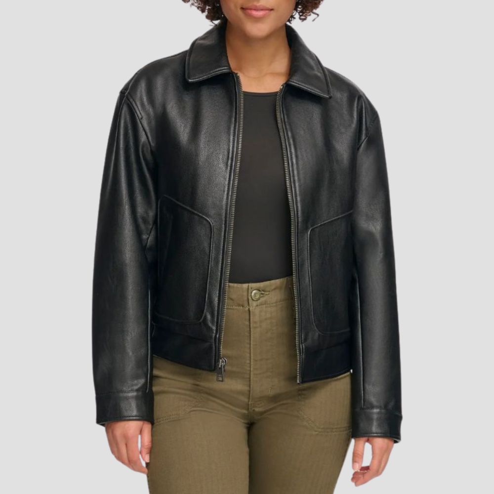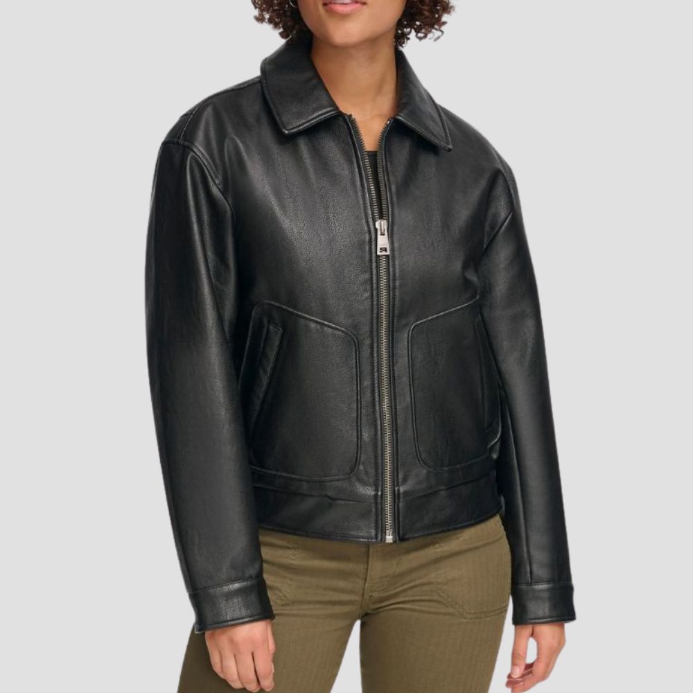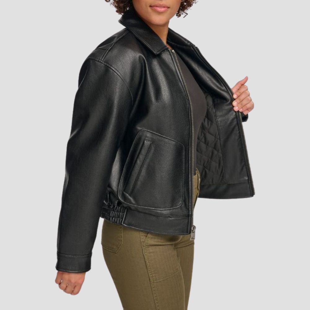 Description: This boxy bomber jacket made from soft faux leather is sure to be a go-to styleto layer over wardrobe...