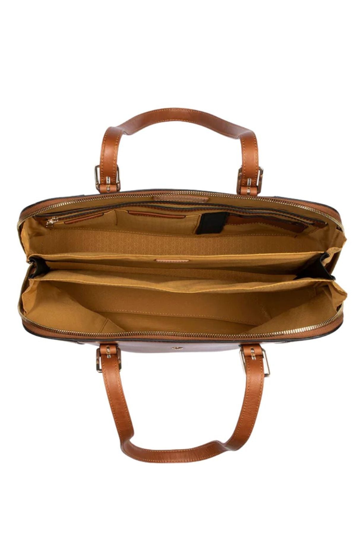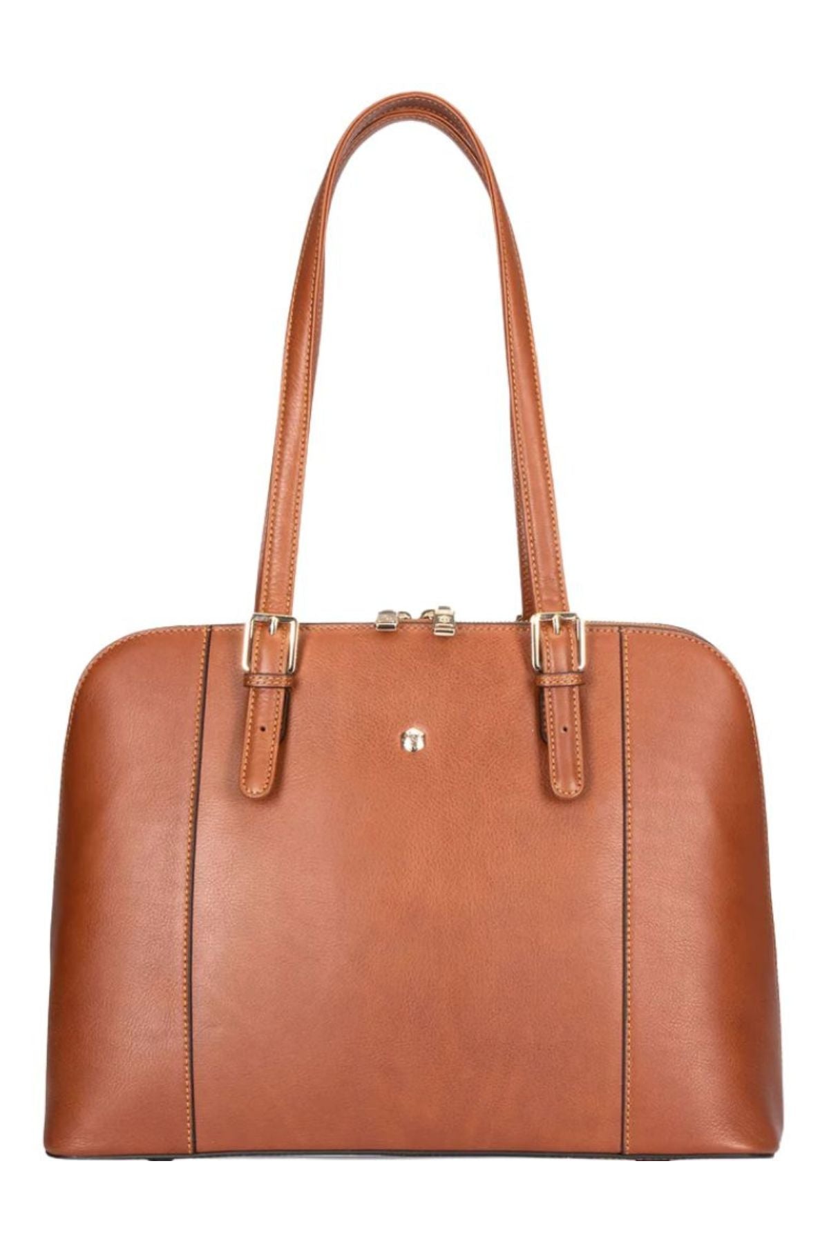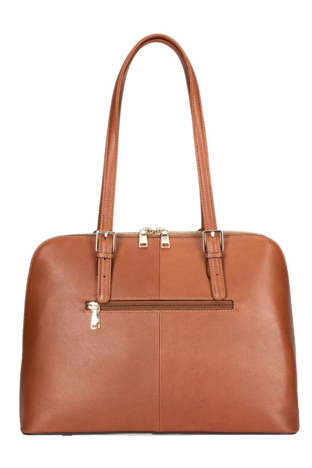 Description: Elegant tan leather structured handbag featuring dual compartments, top zip closure, and adjustable shoulder straps with gold hardware. Crafted...