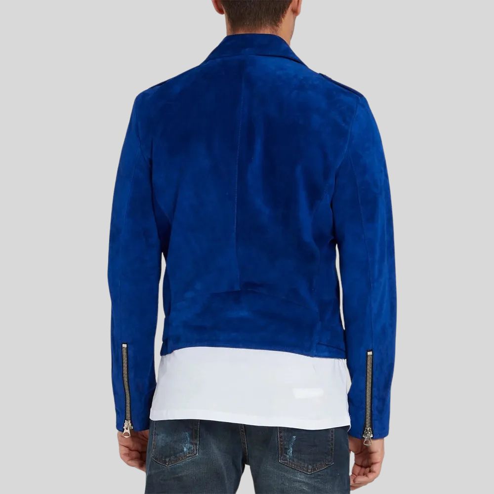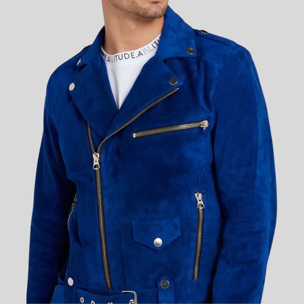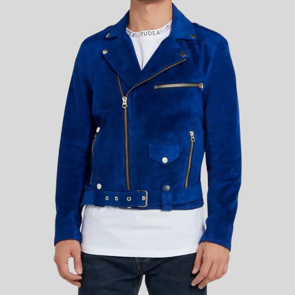 Description: Vibrant blue suede biker jacket with asymmetric zip, silver hardware, and adjustable waist belt. Premium genuine suede with classic...