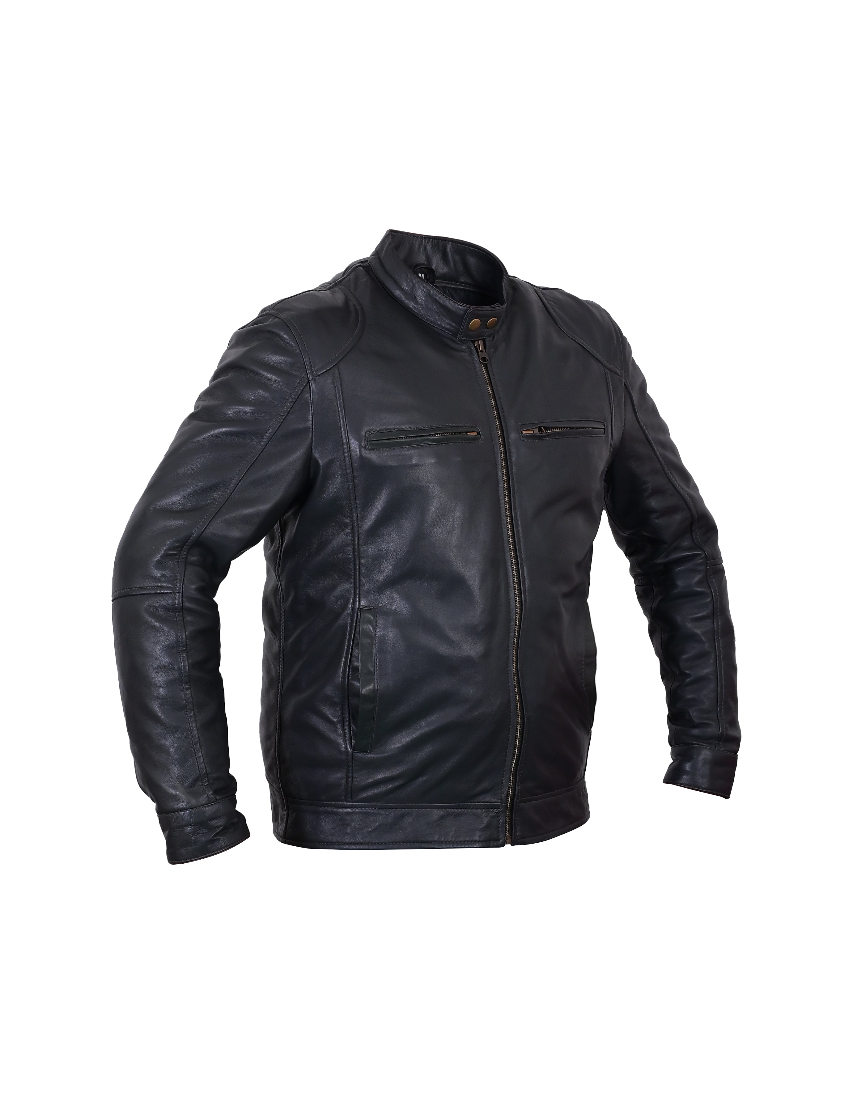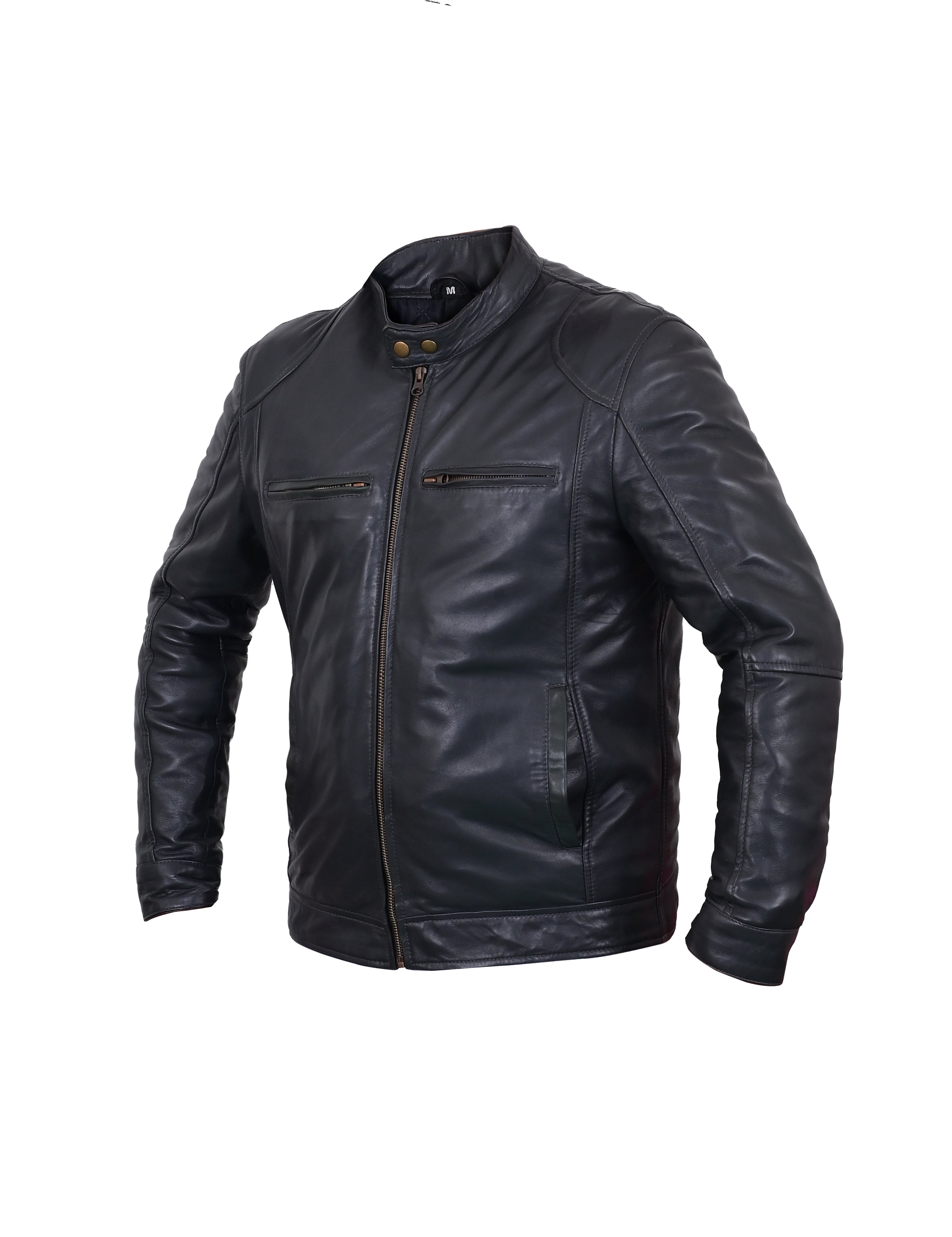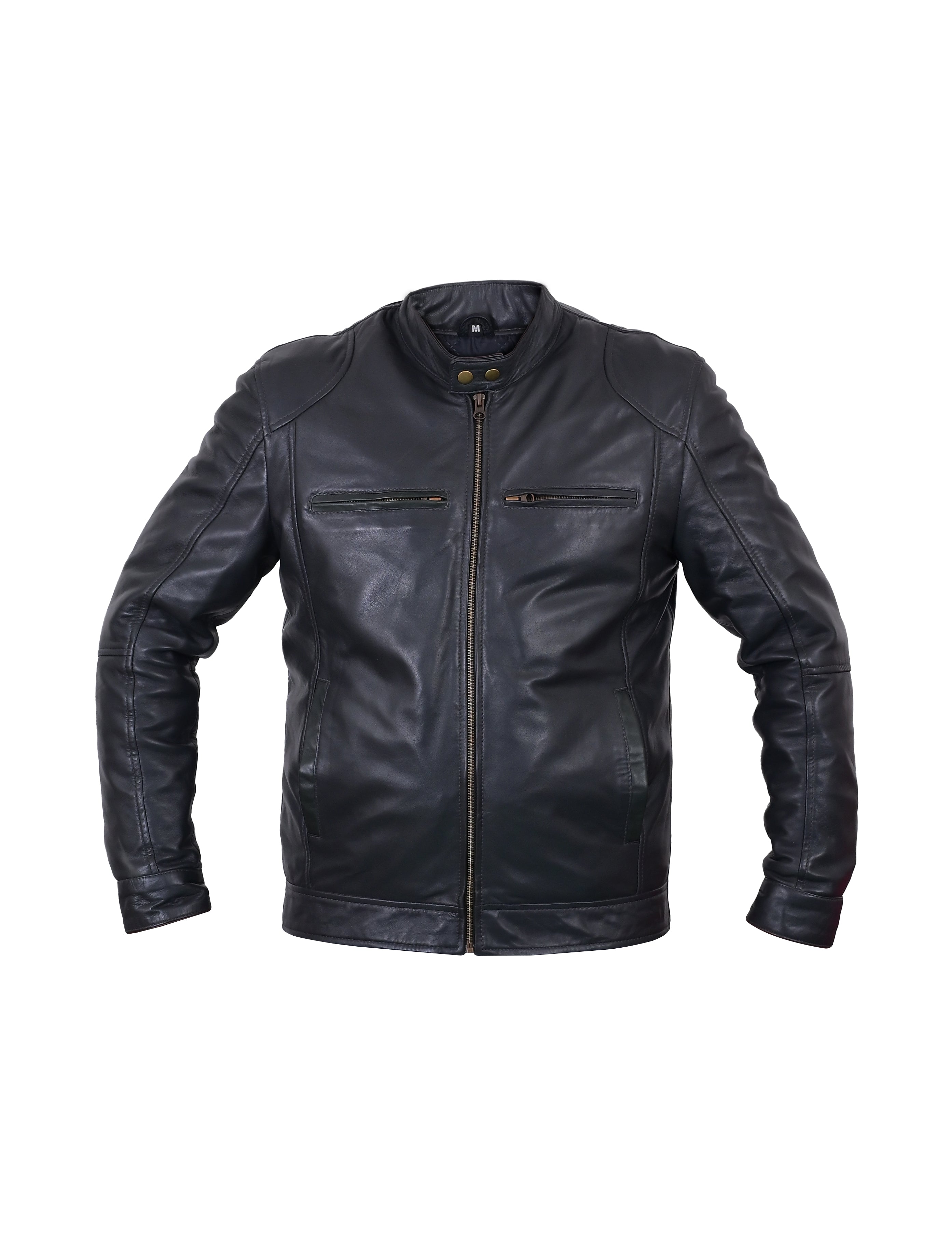 Men’s black biker jacket crafted from durable Mesha leather, featuring a smooth YKK metal front zipper and soft polyester inner lining for...
