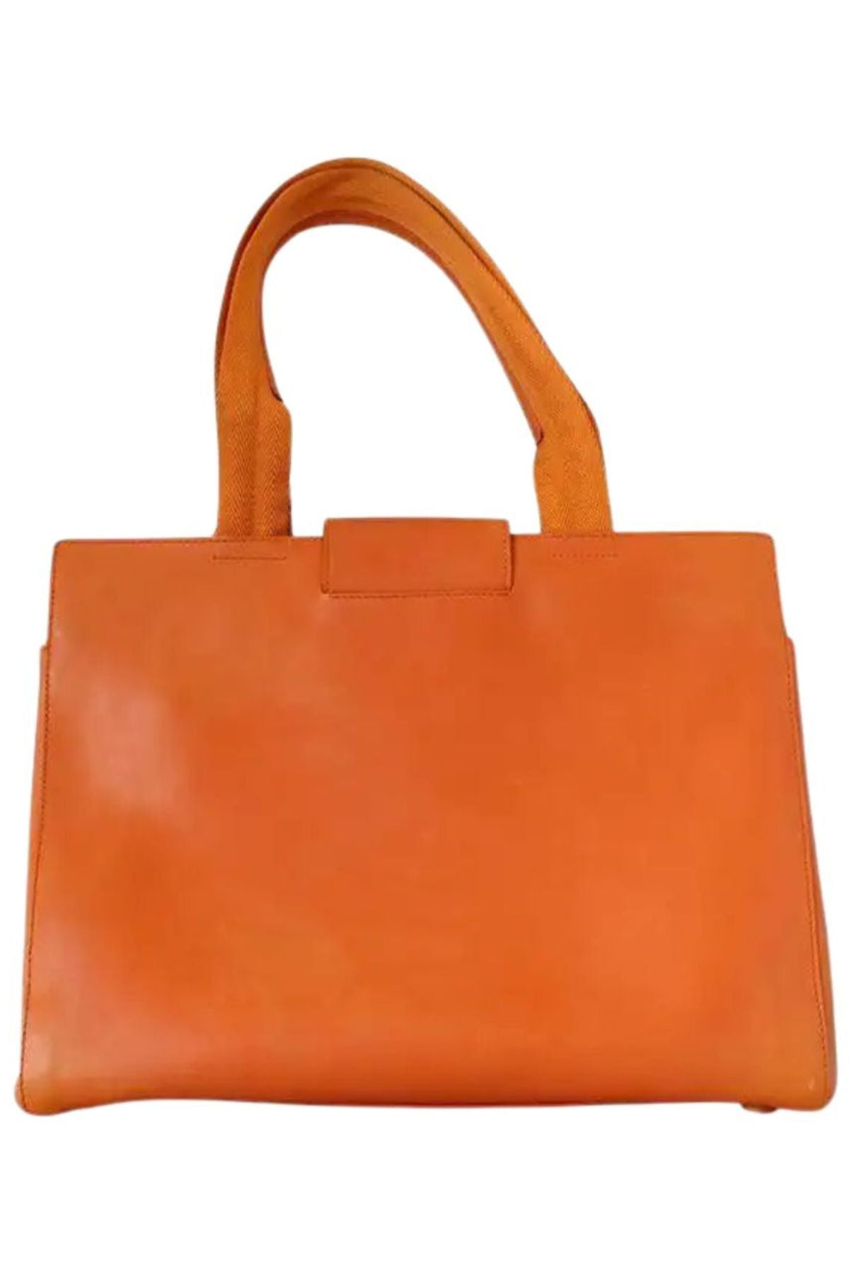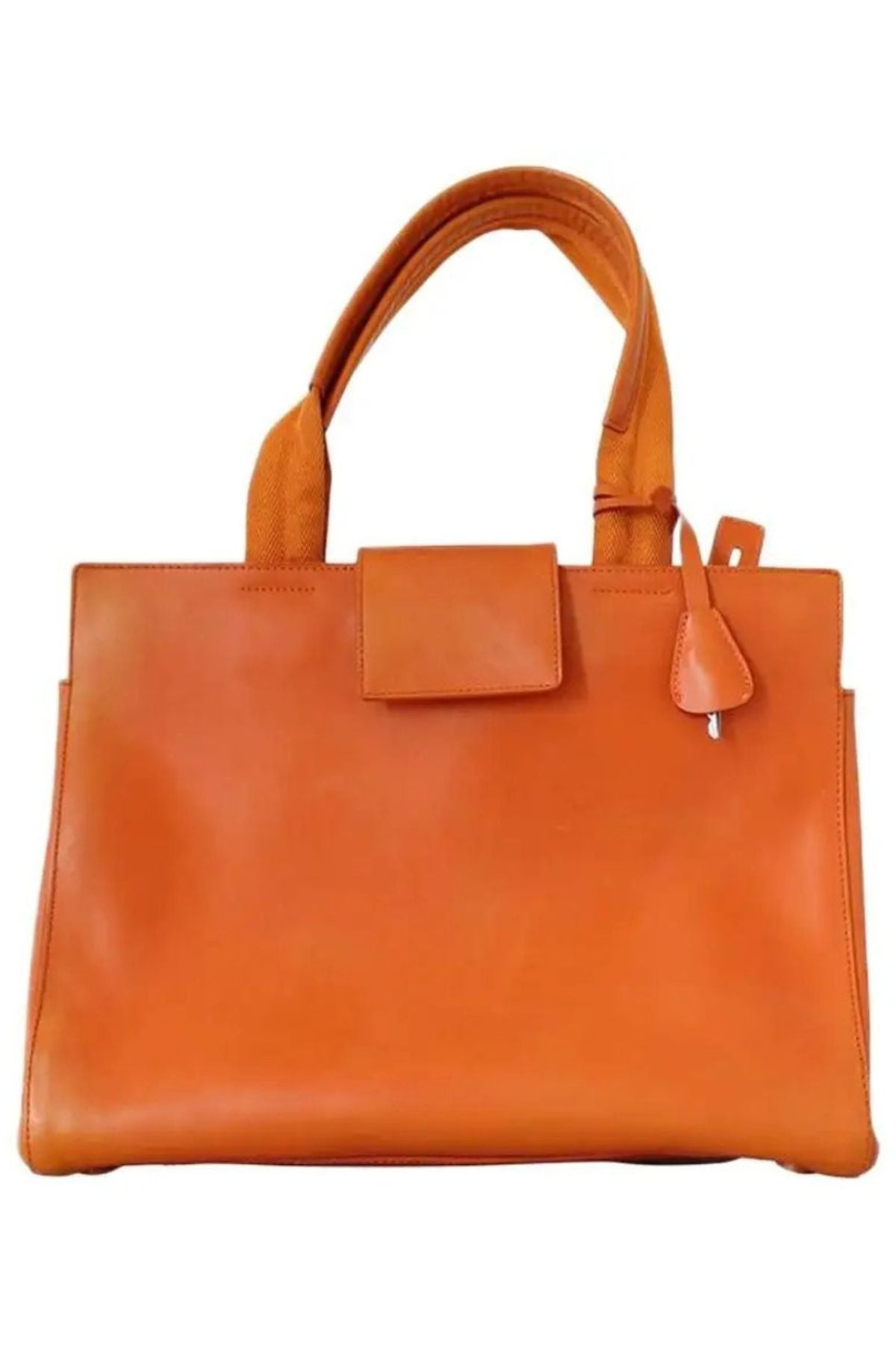 Description: Bold orange leather handbag featuring structured silhouette, dual top handles, decorative charm detail, and magnetic flap closure. Crafted from...