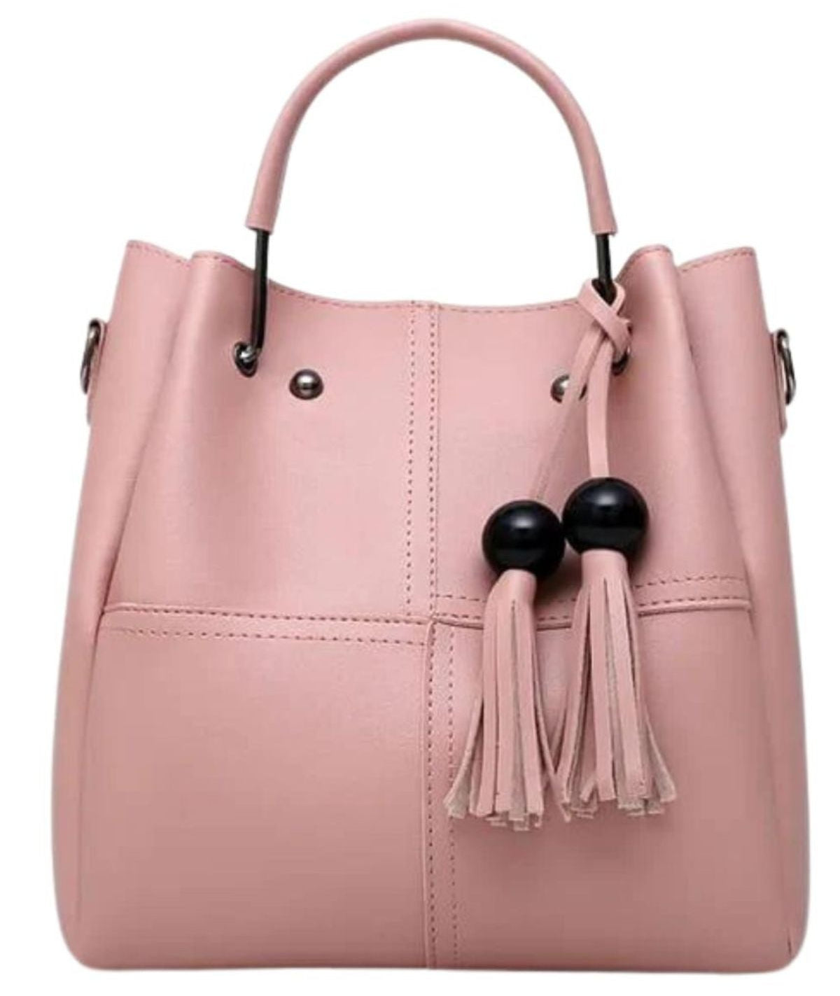 Description: Chic pink leather bucket bag featuring dual tassel charms, top handle, and adjustable shoulder strap. Crafted from premium smooth...