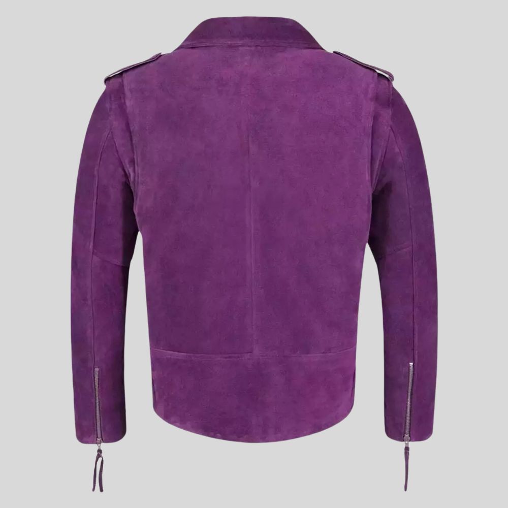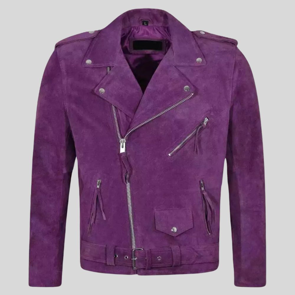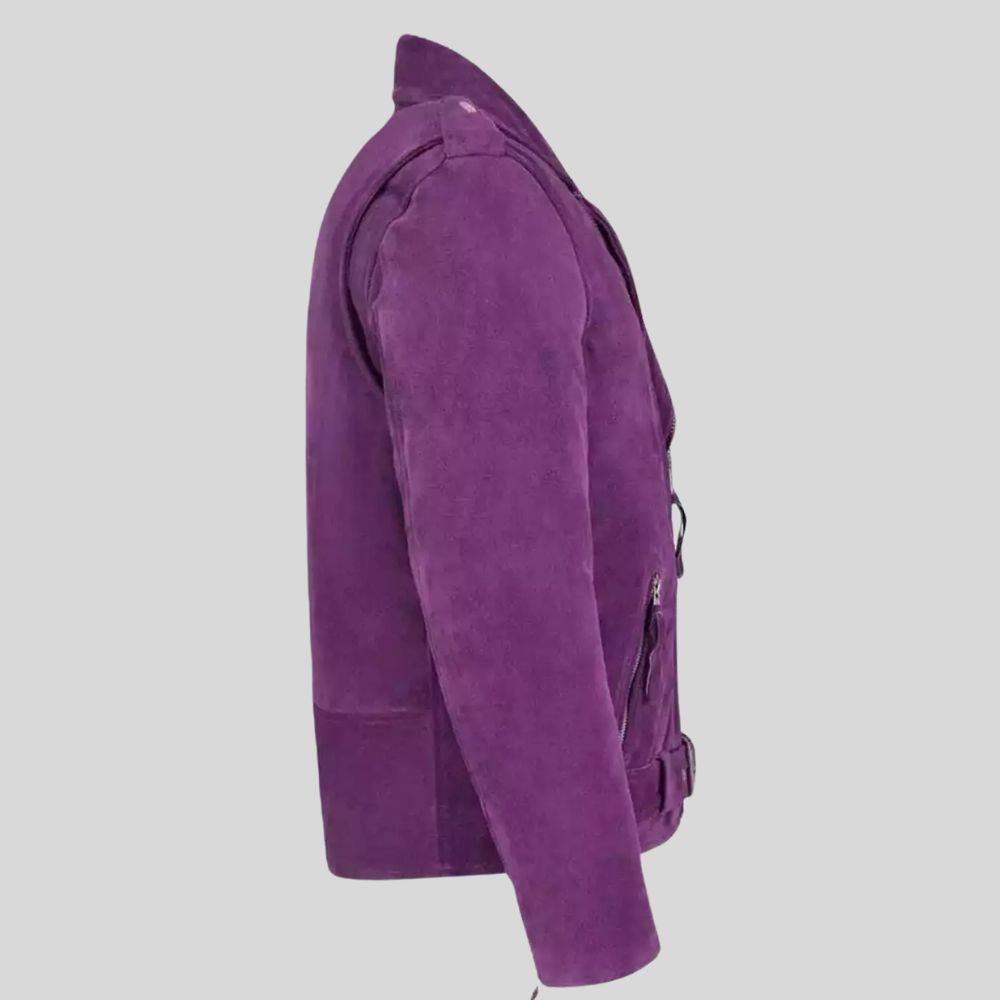 Description: Striking purple suede biker jacket with asymmetric zip, silver hardware, and adjustable waist belt. Premium genuine suede with classic...
