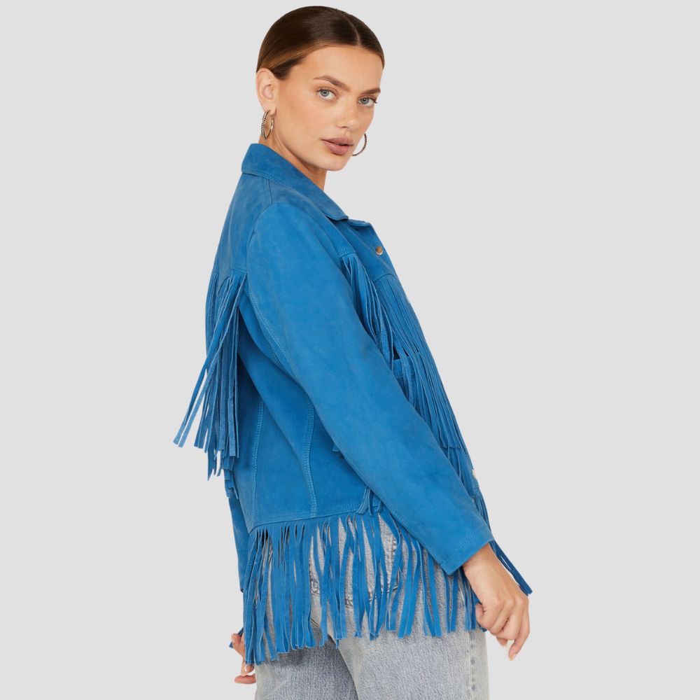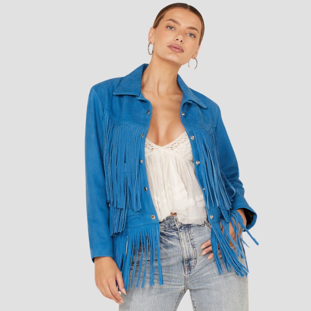 Description: Color: Blue Main: 100% Lamb Leather / Lining: 100% PolyesterSpread collarLong sleevesWestern yokesFringe details along yokes and hemTwo hand...
