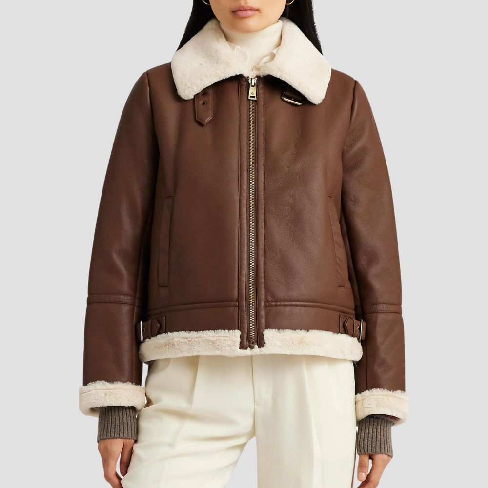 Description: Color: Dk CuoioPlush faux shearling trims the collar, cuffs, hem and inner placket of this zip-up faux-leather jacket moto-detailed with...