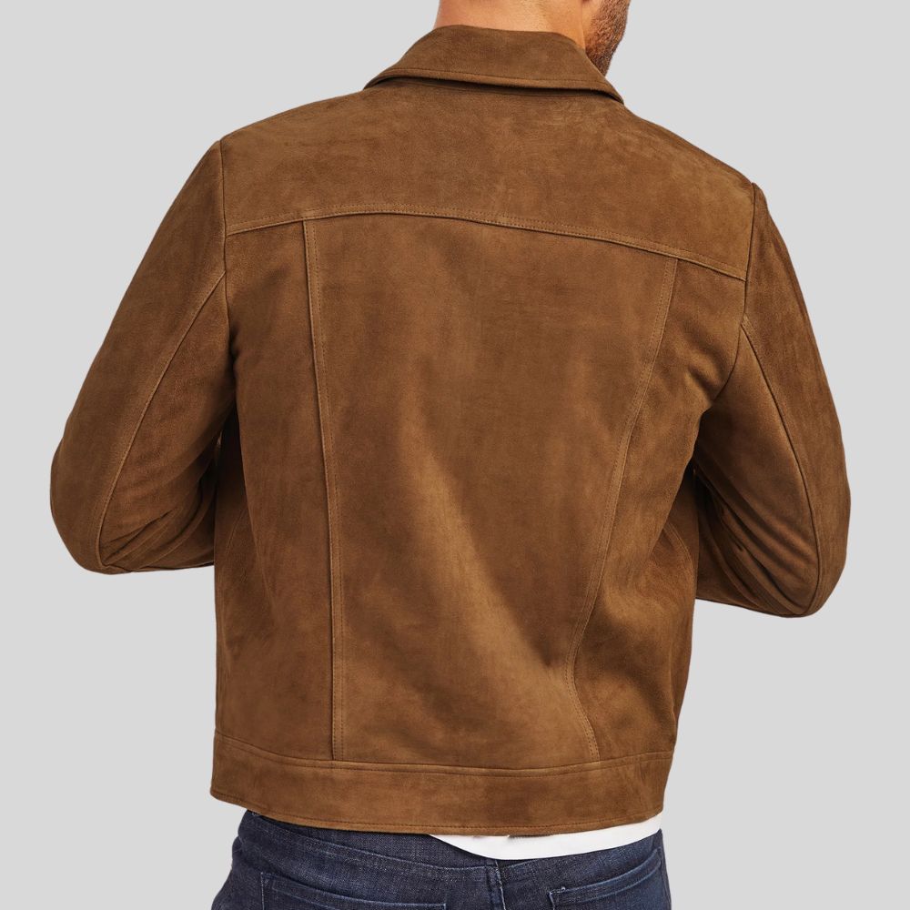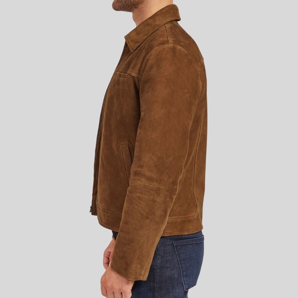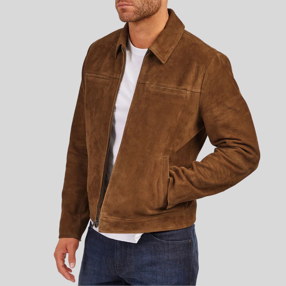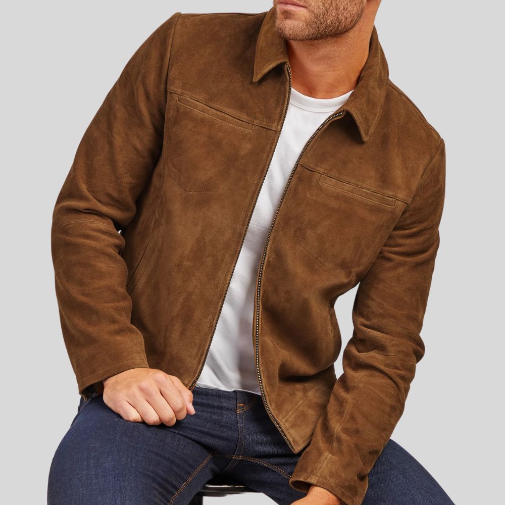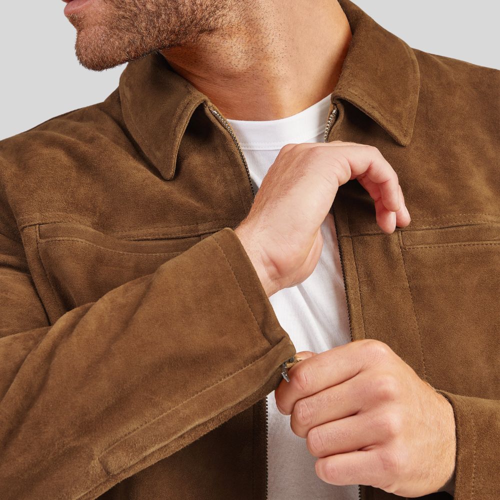 Description: Timeless tan suede jacket with classic collar, full zip closure, and chest pocket. Crafted from premium genuine suede with...