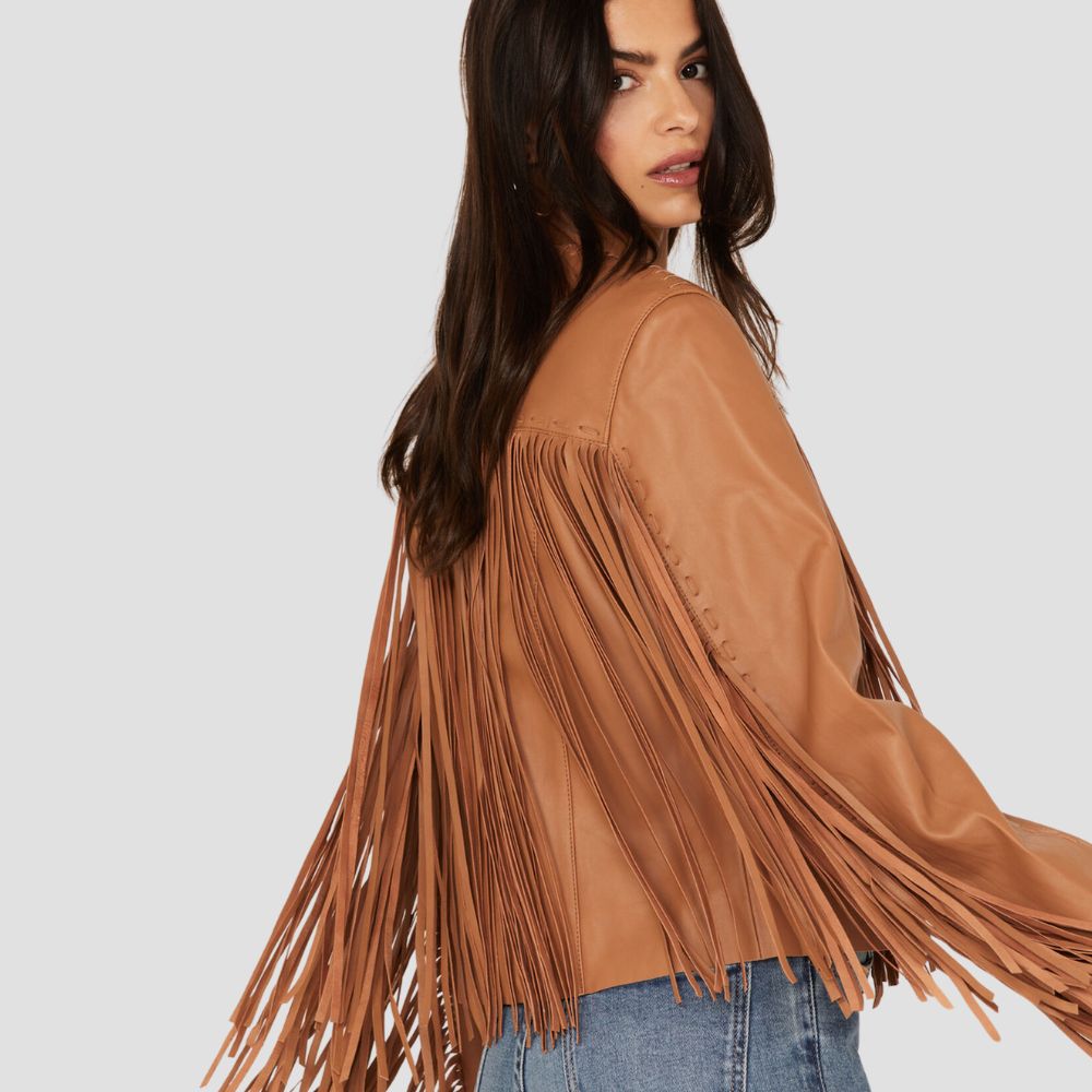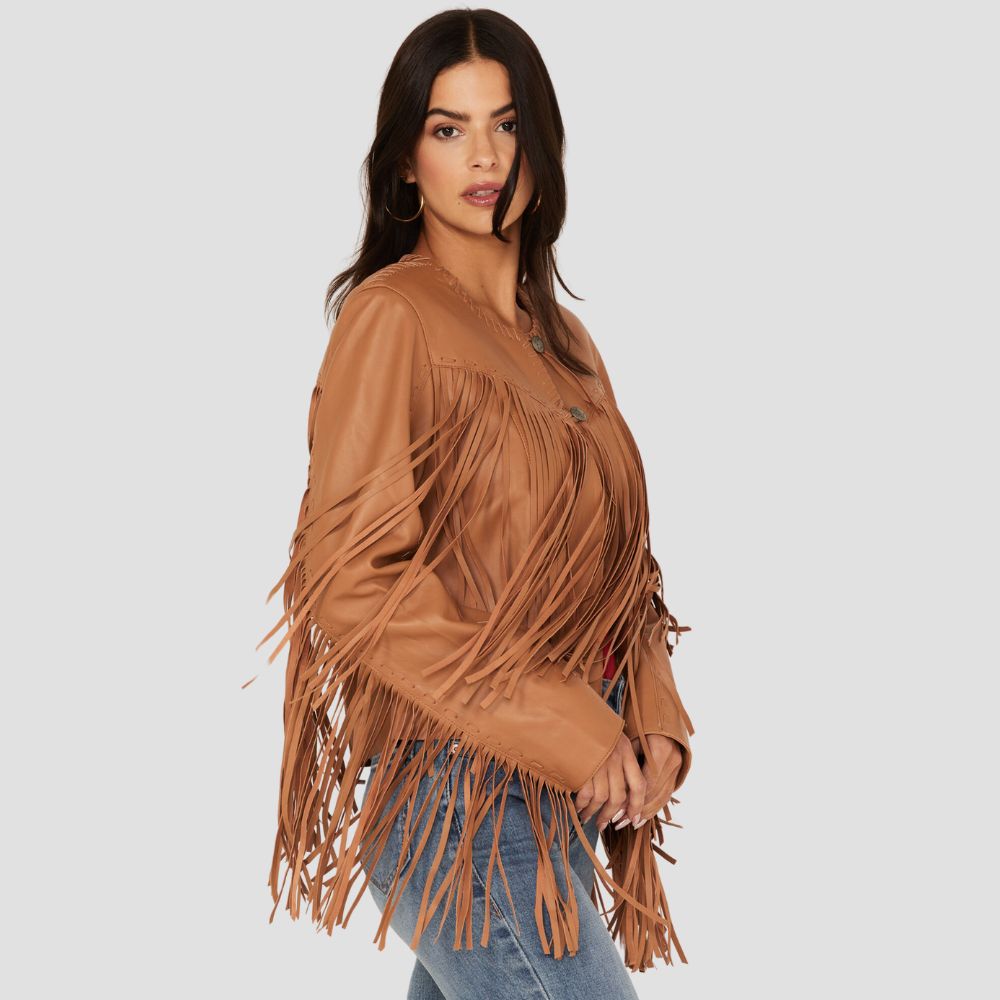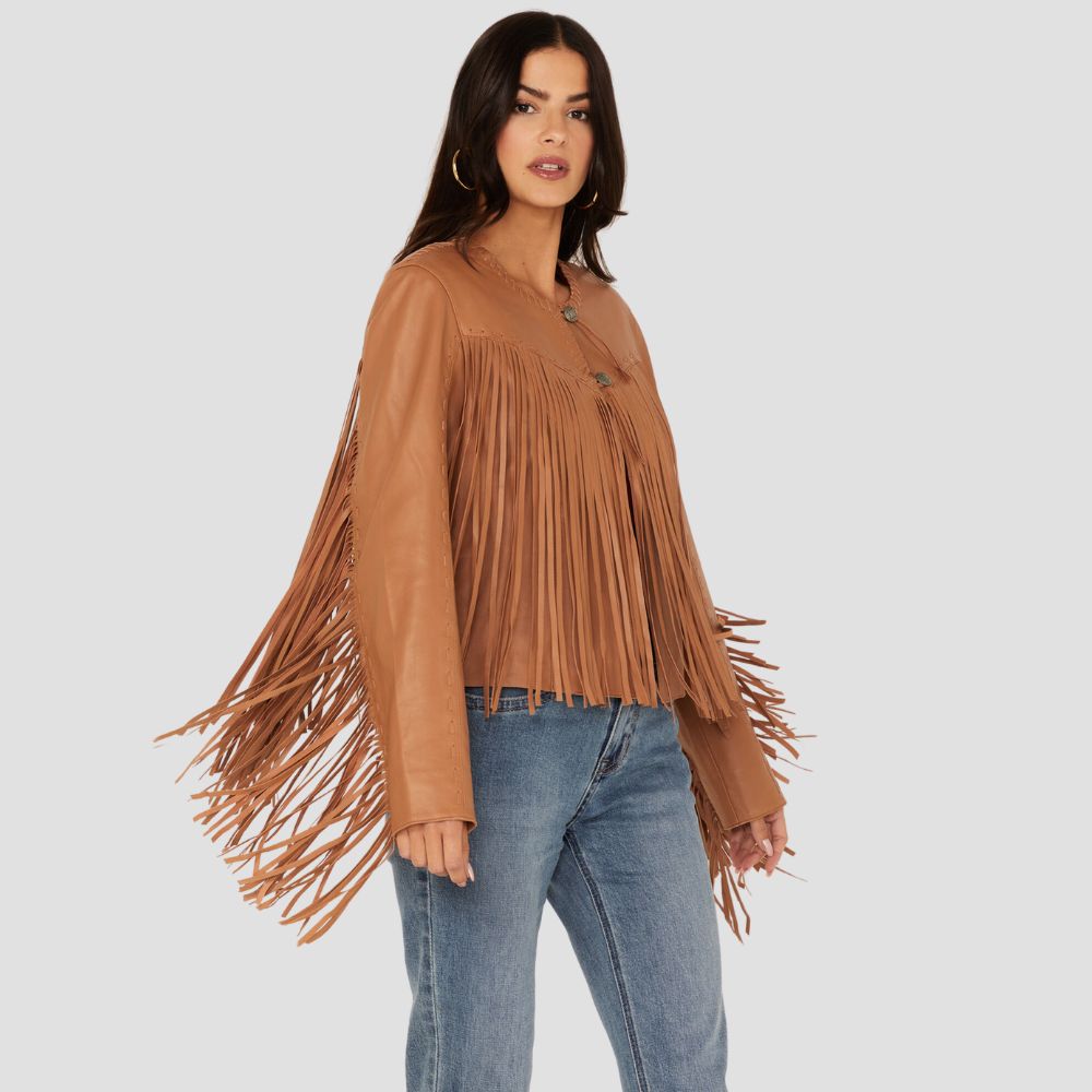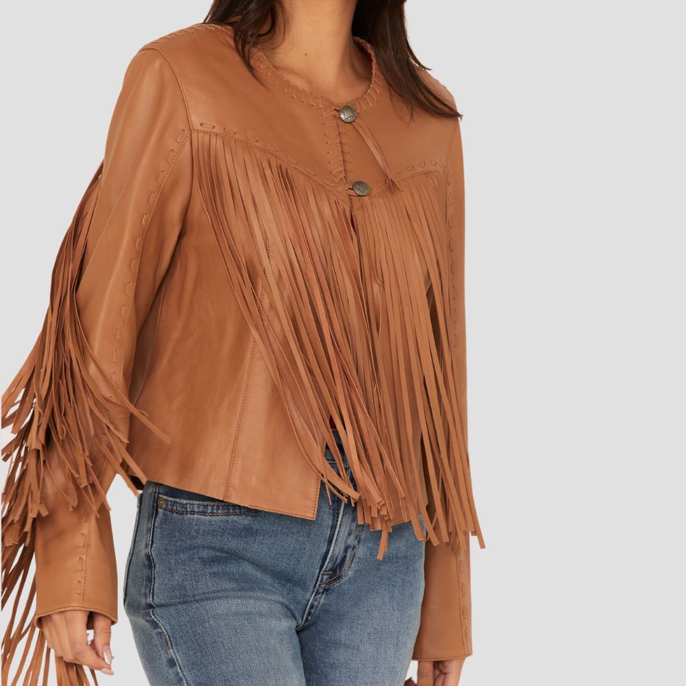Description: Color: Tan Buckstitch details with whipstitch collarLong sleevesFringe on front, back and sleevesButton downStraight yoke on backCurved yokes on...