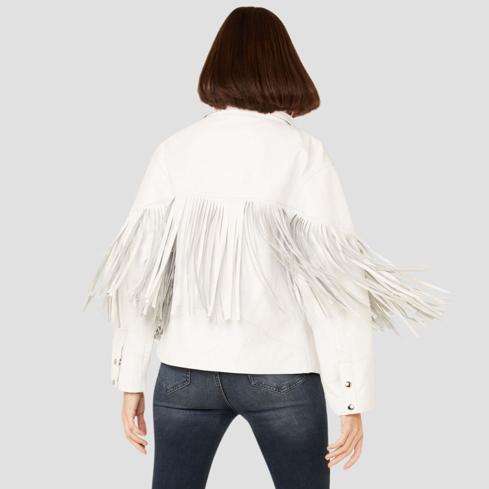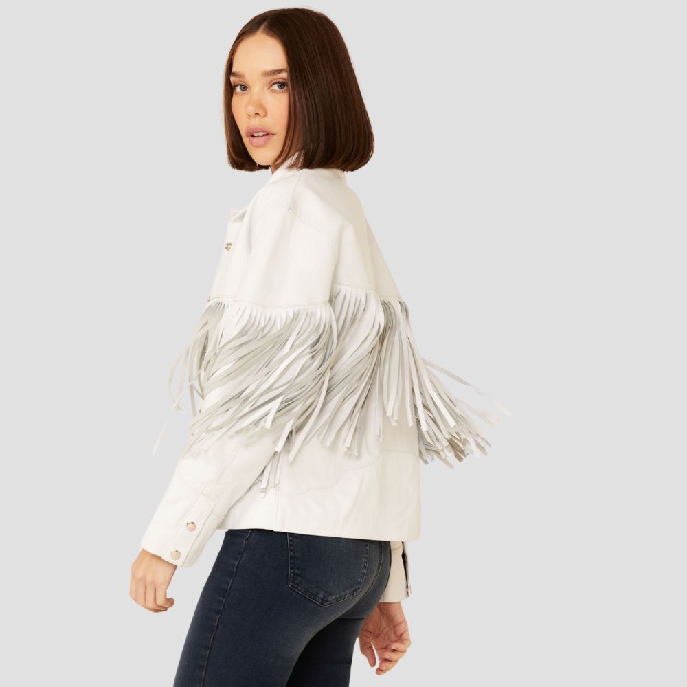 Description: Color: White Lambskin leatherSnap front closureTwo front pocketsAdjustable snap cuffsLong fringe detailing across front and backProfessional leather cleaning onlyImported