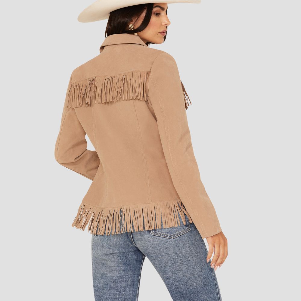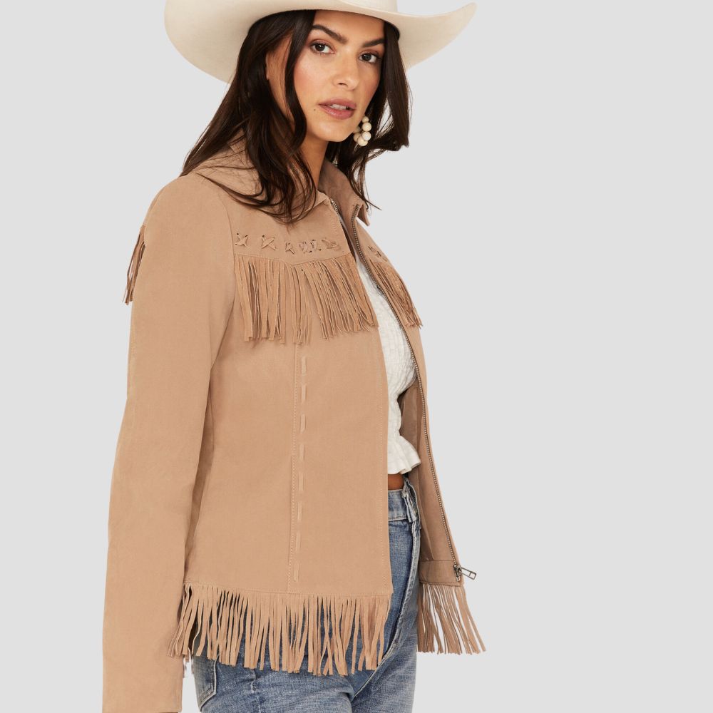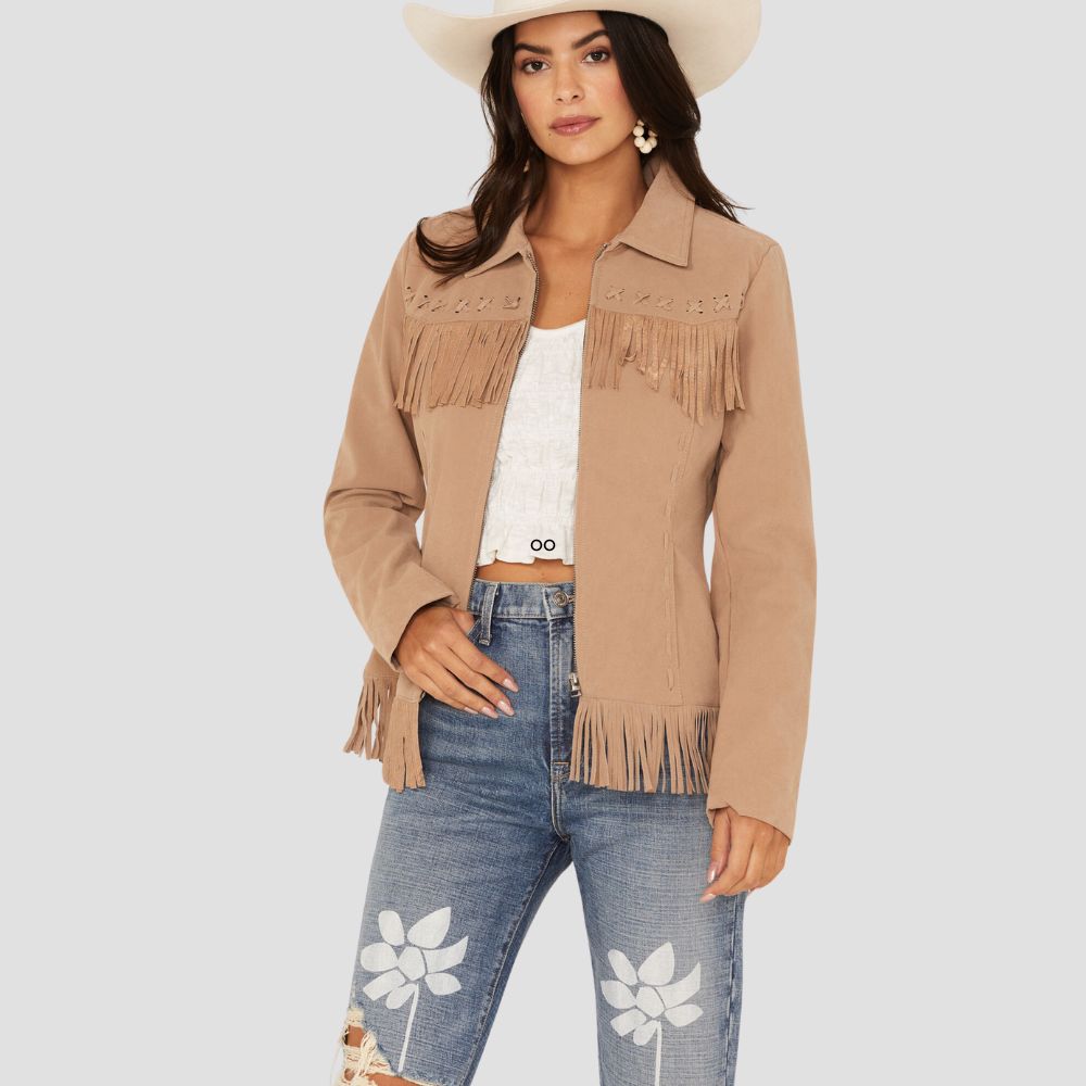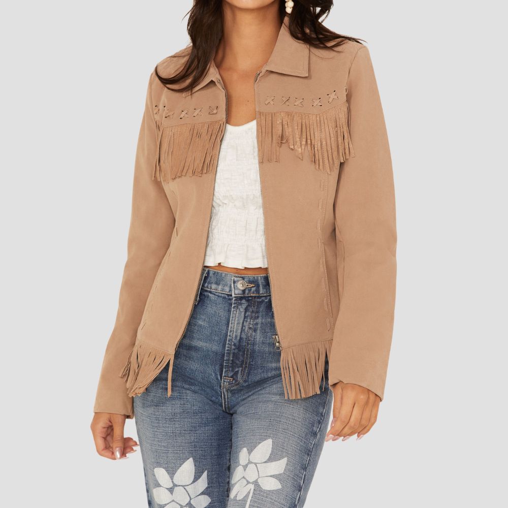 Description: Color: Beige/khaki Khaki faux leatherFull-length zip closureSpread collarLong sleevesStraight yokesFringe detailing along yokes and hemBuckstitched front seam designImported