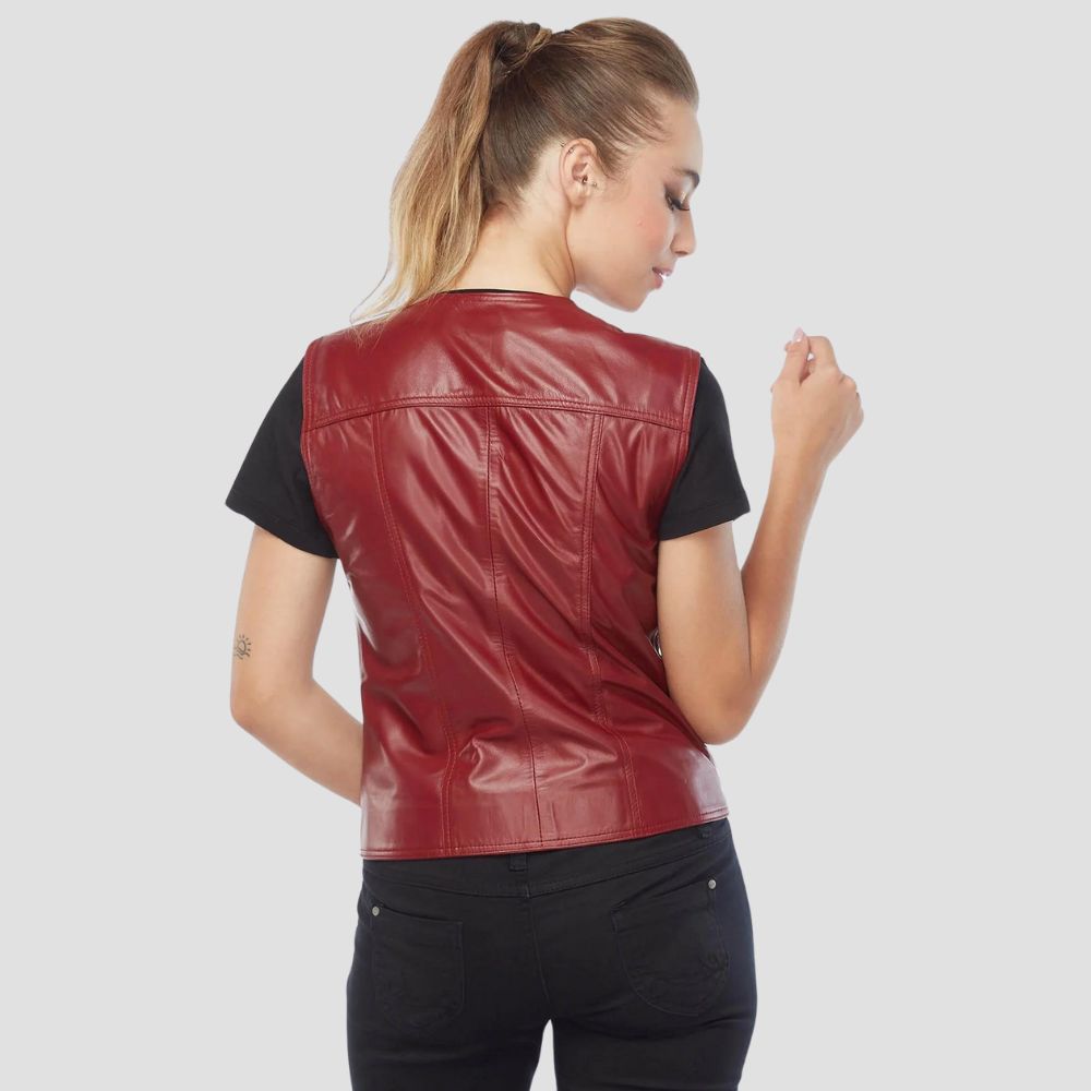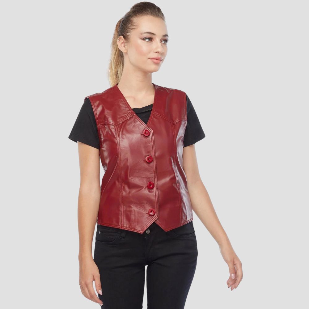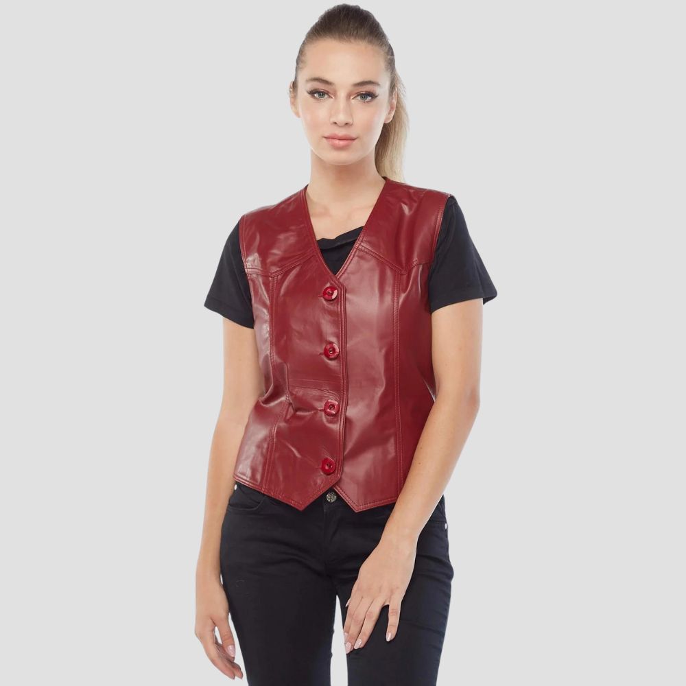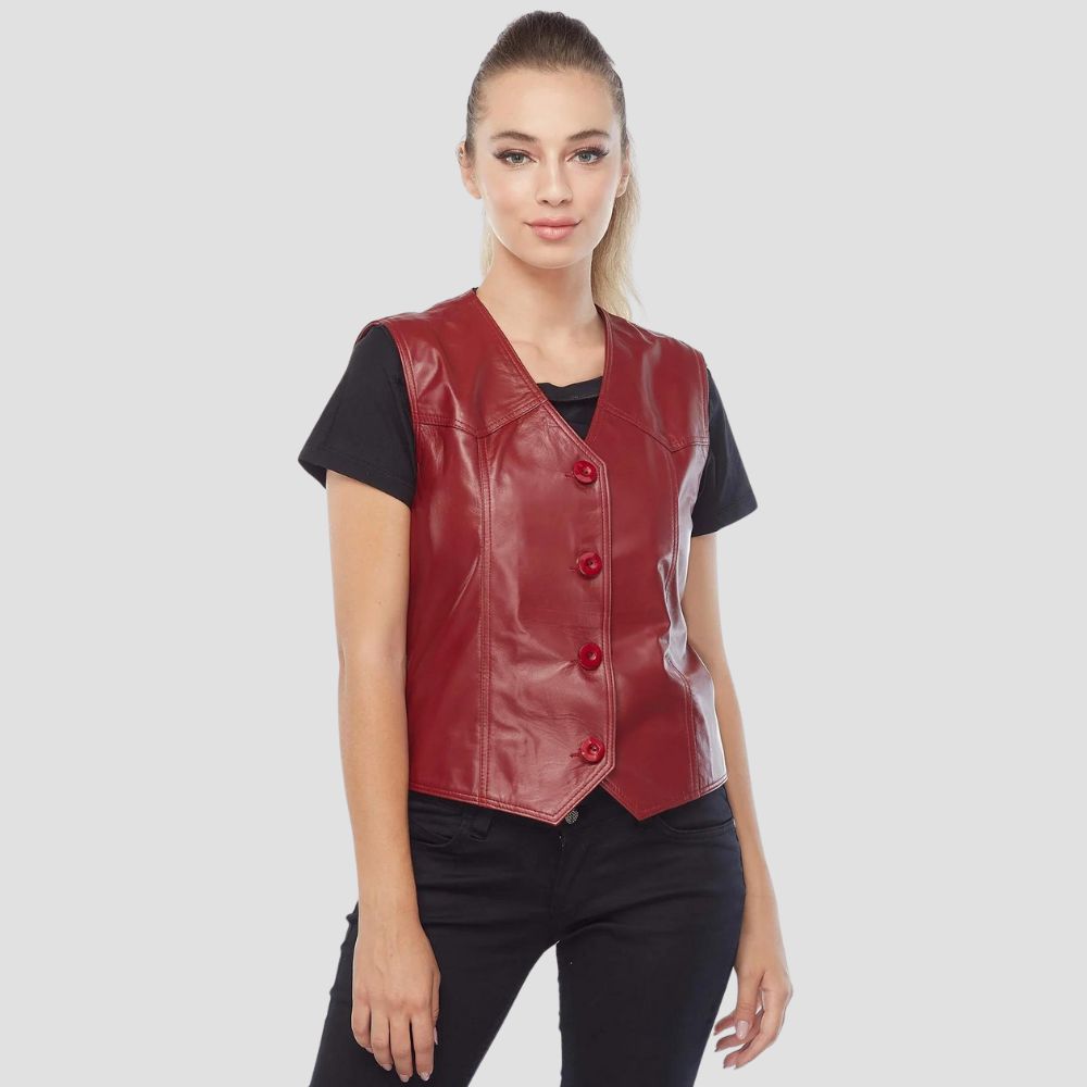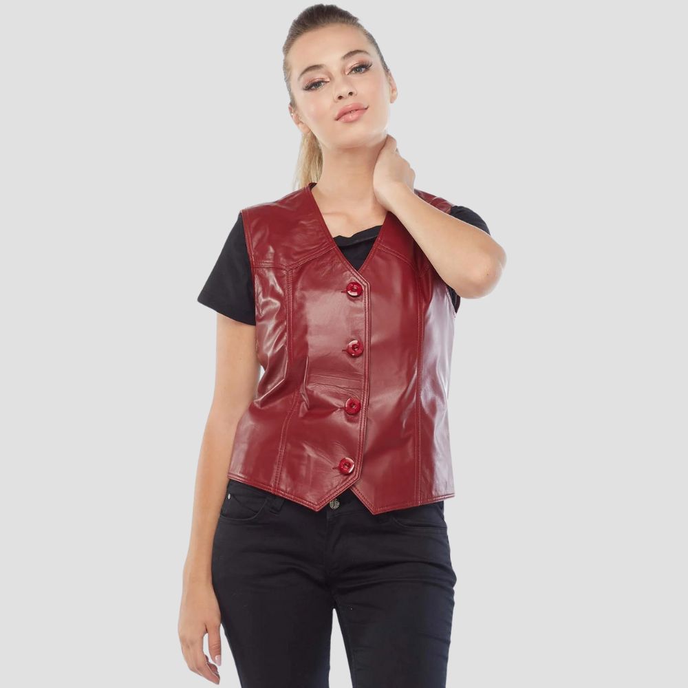 Description: Material: 100% lambskin leatherColor: RedInner: Viscose liningSnug fitCropped lengthV neck designSmart Waist CutFull button up closureAccented with exquisite stitchlinesWarm...