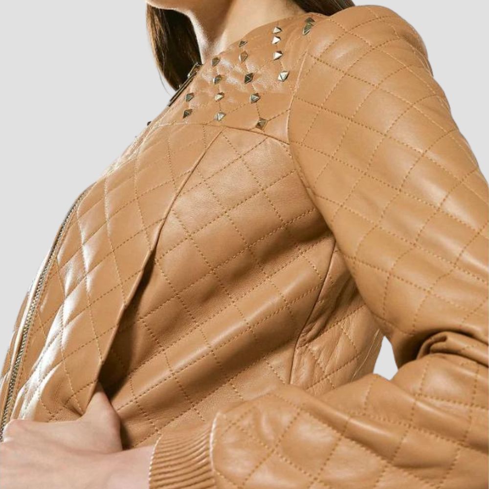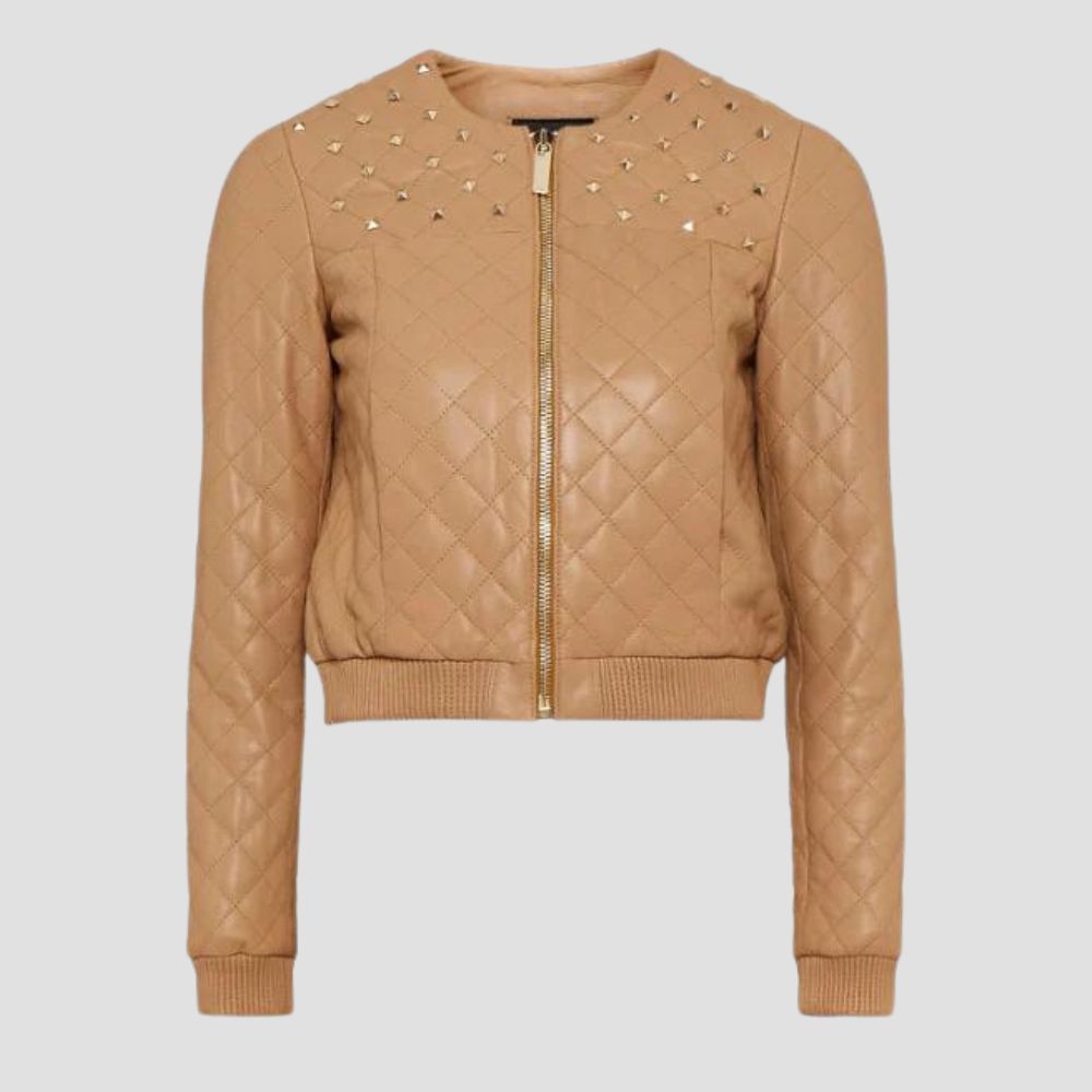 Women's Tan Beige Leather Studded Bomber Jacket